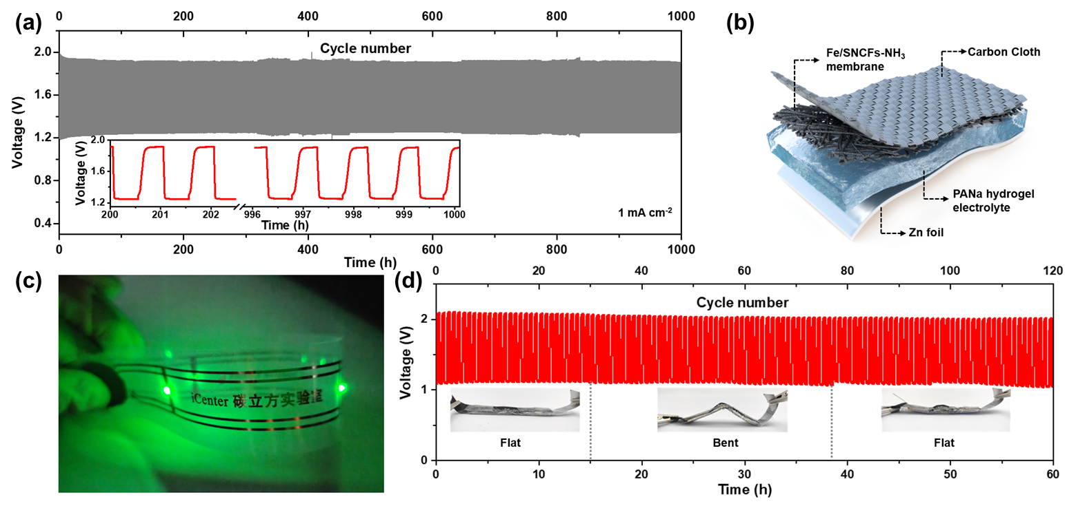 (a)以所制备的催化材料作为自支撑空气电极组装的液态锌-空气电池的循环稳定性。(b)柔性固态锌-空气电池结构示意图。(c)所得电池在柔性电路组成的LED手环中的应用。(d)柔性锌-空气电池在平直/弯曲/平直状态下的充放电曲线