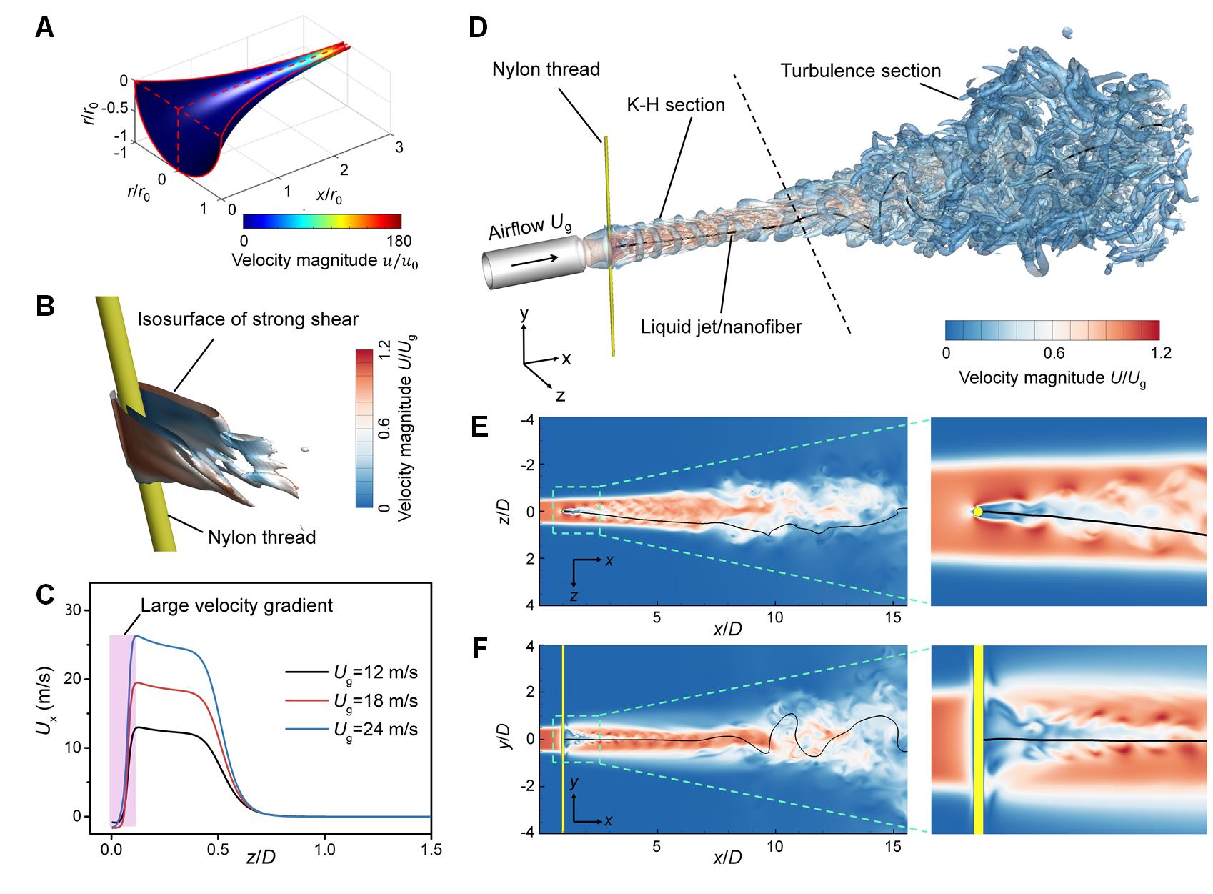 气相和液相高速流体之间的相互作用规律具有重要的基础科学意义;在实际生产中,气、液流的相互作用也具有重要应用价值,例如利用气流对液体溶液的高速剪切可以制备高性能纤维和粉体材料。在材料科学领域,纳米纤维具有独特的物理化学性质,成为最具吸引力的新型材料之一,在环境过滤、能源存储、柔性电子、组织工程和病毒防护等诸多领域发挥着日益重要的作用。为了实现先进纳米纤维材料的工业化应用,发展高通量、高效率、低成本、连续稳定的纳米纤维宏量制备方法具有重要的价值和意义。