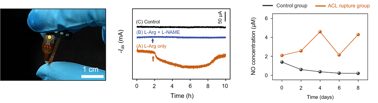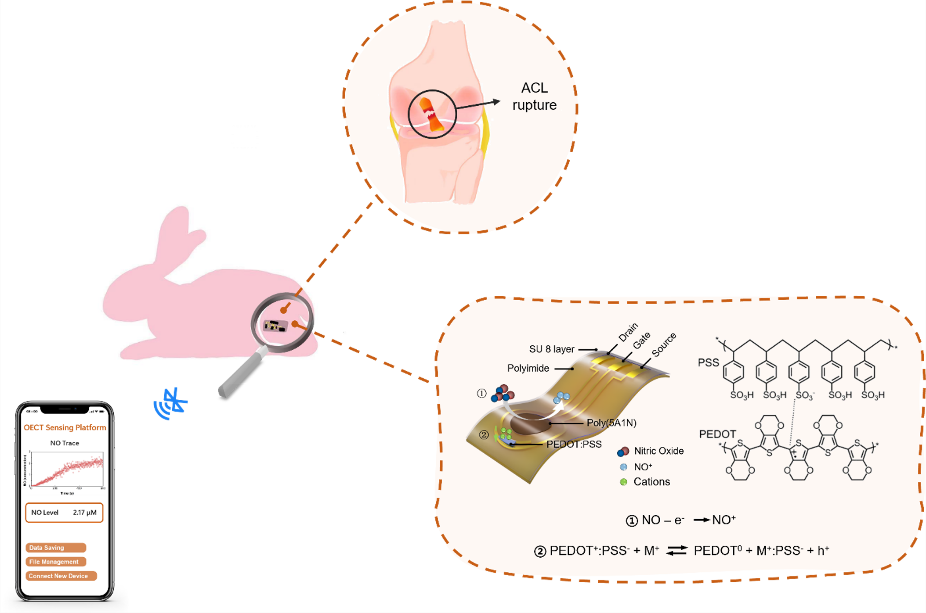 在生物实验中,该传感器能够连续检测软骨细胞释放的纳摩尔级别内的一氧化氮长达数小时,且检测前后器件没有明显的信号漂移。此外,结合定制的无线电路模块,实现了在前交叉韧带断裂损伤的新西兰大白兔关节腔8天的一氧化氮实时、无线测量,实验观察到的高水平一氧化氮浓度与骨关节的后期病变有关,为创伤后骨性关节炎的早期诊断和预防性治疗提供了关键信息。