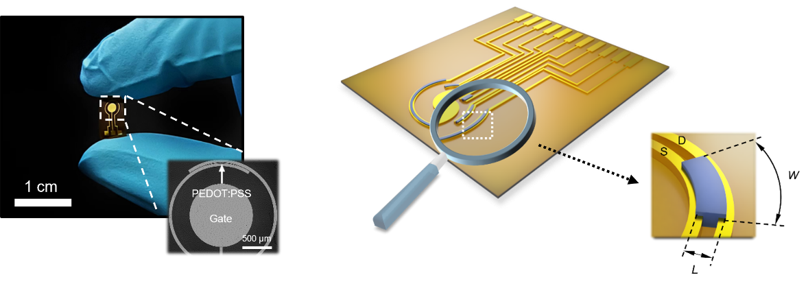 本工作提出了一种基于有机电化学晶体管的具有高灵敏度的柔性一氧化氮生物传感器,通过设计晶体管有机沟道的几何形状和栅极材料,实现了器件对一氧化氮信号的最佳放大。与传统电化学传感器相比,该传感器具有低响应极限、宽线性范围、高灵敏度和优良的选择性,并具有小型化的传感区域。