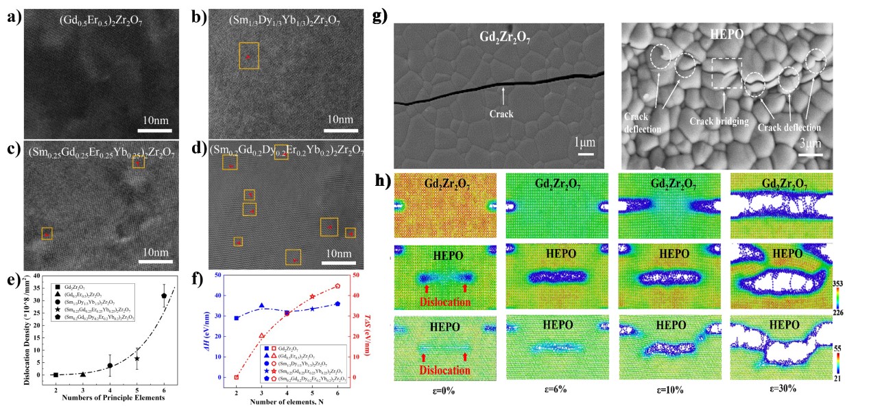图2(a-f)高熵陶瓷中位错密度随熵的变化趋势;(g-h) 裂纹与位错的相互作用