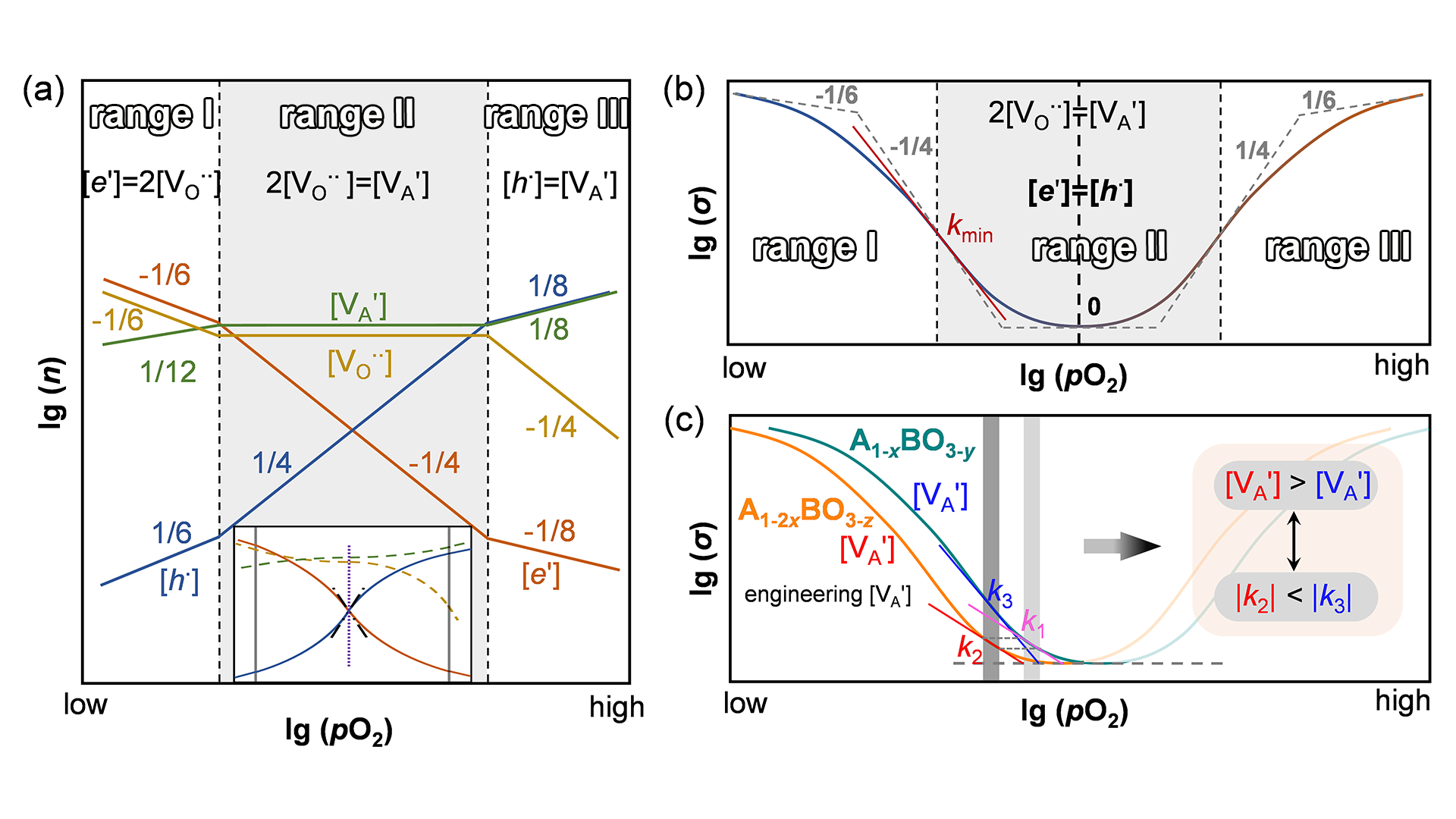 近日,yl88858永利集团对KNN材料的缺陷化学环境进行理论分析,得出了A位缺陷浓度、氧空位浓度、电子浓度和空穴浓度在不同氧分压区间和氧分压的关系。并根据该关系提出了比较两种钙钛矿A位缺陷浓度的测试分析方法。结果表明,在同一氧分压区间内对两种钙钛矿进行电导率测试,电导率-氧分压斜率越陡峭代表材料中A位缺陷浓度越低(图1)。将此方法应用于KNN中,对KNN和A位过量的KNN(KNN-Na)进行电导率比较,可以发现KNN-Na的电导率斜率较KNN陡峭,KNN-Na中A位缺陷较低。这与实验设计和ICP测试结果一致。