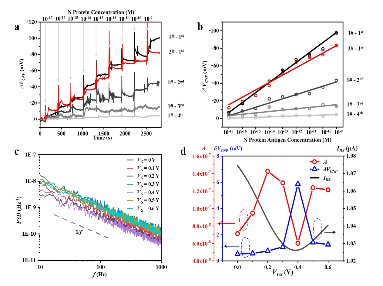 图2.GFET传感器检测SARS-CoV-2病毒N蛋白抗原及噪声频谱测试。(a)和(b)加入10 aM至1 nM浓度N蛋白溶液时狄拉克点移动量△VCNP的变化;(c)液栅电压从0 V至0.6 V时GFET的噪声功率谱密度(PSD);(d)转移特性曲线(黑), 归一化噪声强度A(红)和推算理论检测限(蓝)