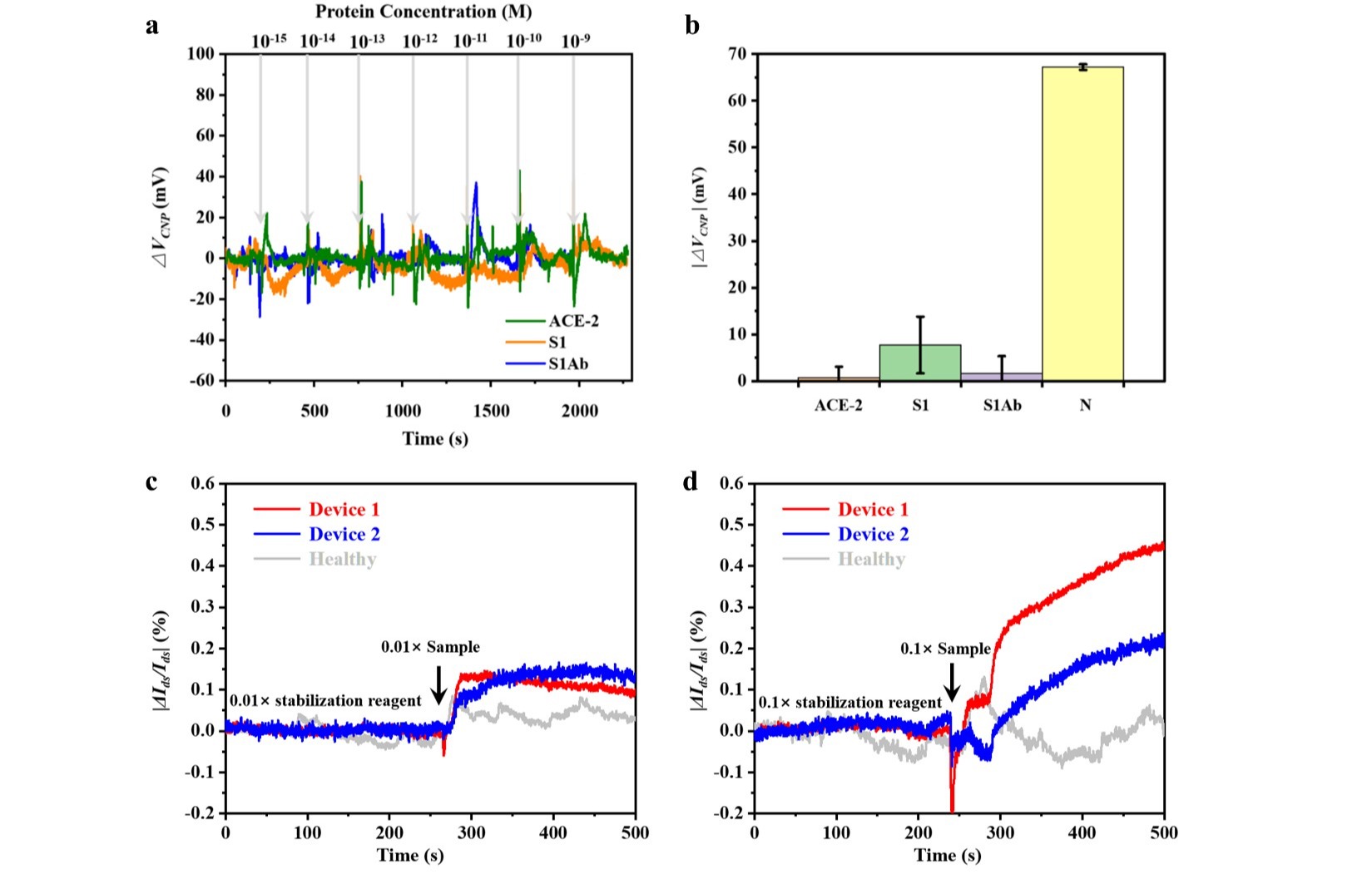 图3.GFET传感器特异性及咽拭子样本检测。(a)将不同浓度的 ACE-2、S1、S1Ab 蛋白溶液加入N蛋白抗体功能化GFET传感器时的变化。(b)1 pM浓度ACE-2、S1、S1Ab和N蛋白溶液的变化比较。(c) COVID-19患者样本与健康人样本(均稀释至 0.01×)的实时|ΔIds/Ids|信号响应。(d)COVID-19患者样本与健康人样本(均稀释至 0.1×)的实时|ΔIds/Ids|信号响应