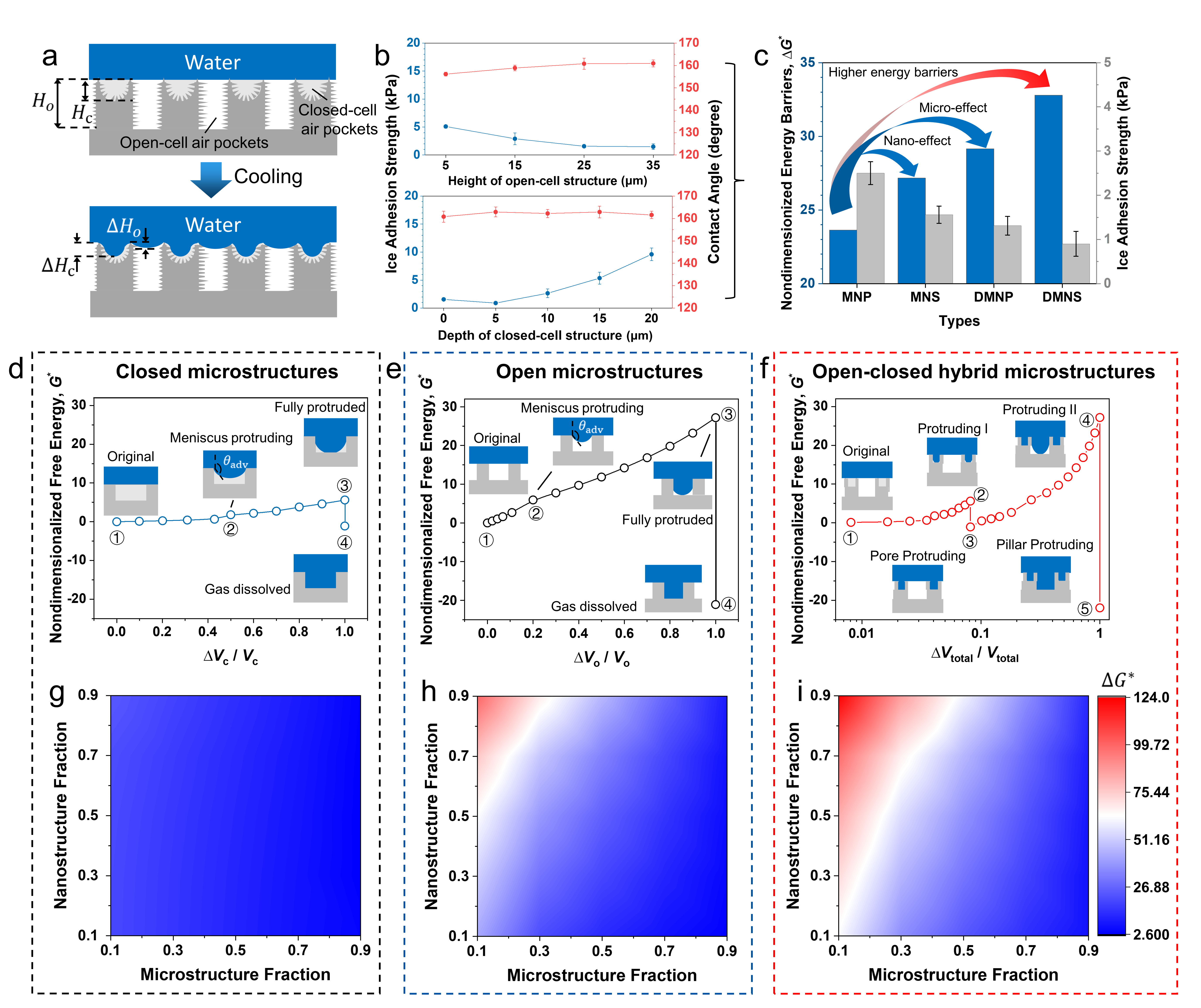 为此,钟敏霖团队首先建立了三相界面热力学能量计算模型,探究不同微纳结构的形貌与分布对润湿性转变过程与热力学能量演变的影响机制。从功能上看,微米结构通常被认为起到机械耐久的物理支撑骨架作用,而纳米结构则起到超疏水功能强化的作用。团队的实验与计算结果则发现对于微纳复合多级结构,尽管微结构的调控对室温超疏水性能的提升并不显著,但会对Cassie状态稳定性与防除冰性能产生较大影响。通过在开放式的微米锥阵列顶端复合封闭式微米坑阵列,可以改变传统的三相界面在微纳结构中的单步钉扎过程,实现一种新型的三相界面分步钉扎过程。在热力学上,这种三维方向微结构差异诱导表面热力学能量状态在传统单能垒Cassie状态-Wenzel状态基础上,引入第二Cassie状态能垒,使之转变为双能垒的Cassie I-Cassie II-Wenzel状态,从而极大地提高Cassis状态转变为Wenzel状态的壁垒,并且在纳米结构的作用下可以进一步同时提高双能垒峰值,显著地提高CB状态热力学稳定性。同时在动力学上,三维方向上不同微结构内部三相界面气囊压强分布的差异可以改善润湿性转变过程中的受力条件,顶部气囊的优先钉扎可以为三相界面的进一步钉扎提供额外的阻力,从而降低三相界面的钉扎速度与程度,避免微纳结构内部气囊的破坏。