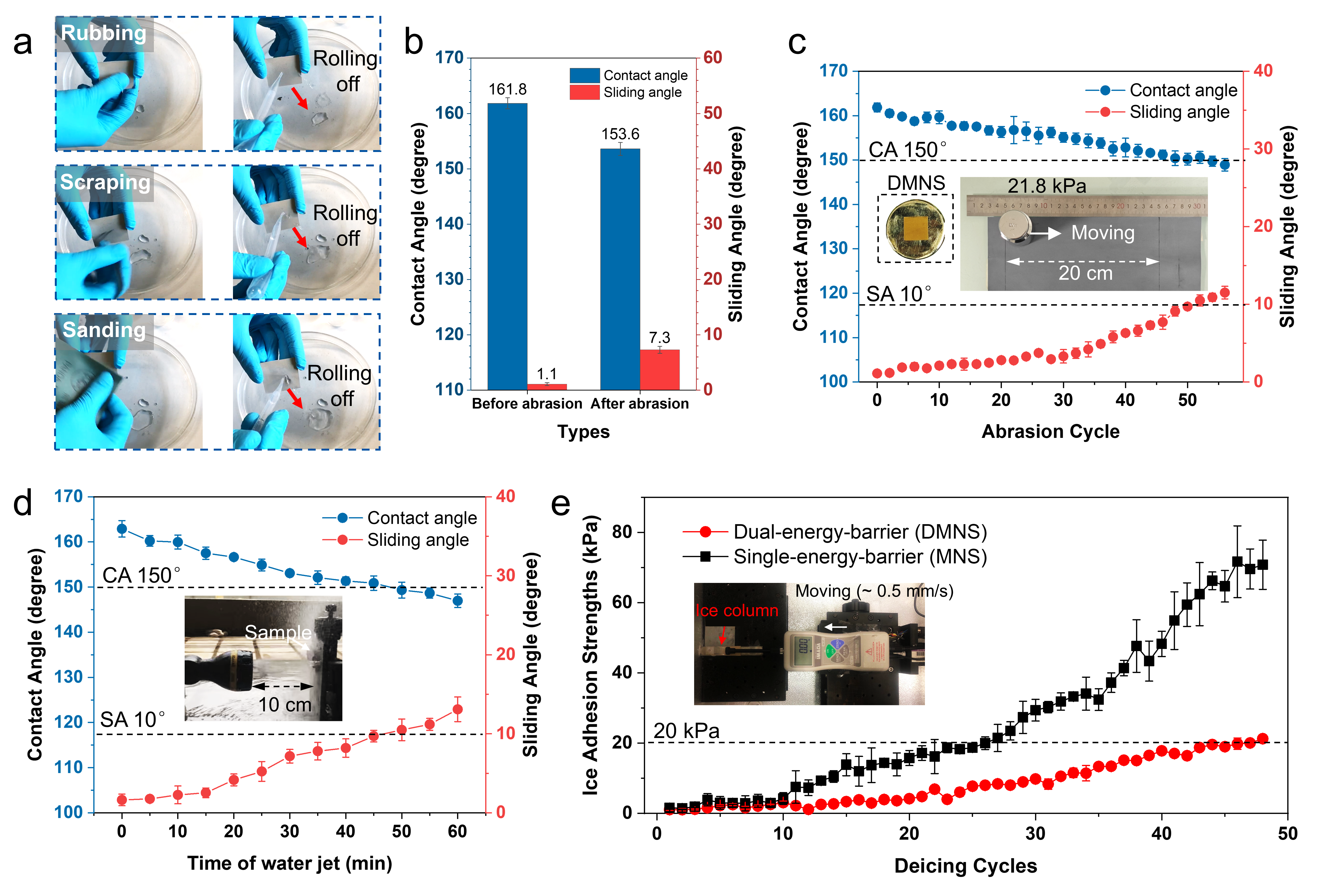 团队采用超快激光分步脉冲注入与化学氧化复合的方法,制备出两组不同类型的微纳复合结构,分别对应采用纳米设计策略和双能垒设计策略的四种超疏水表面。通过一系列防冰与除冰性能测试,发现相较于传统的纳米效应单能垒超疏水结构,双能垒结构具有更高的Cassie稳定性和更优越的防除冰性能。在-15℃的低温高湿环境下可以维持过冷液体不结冰至少27000s,且冰粘附强度仅为0.9 kPa,在连续48次连续除冰循环后仍能维持~ 20 kpa。同时,团队开展了线性磨损、常/低温高压水冲击等测试,证实了所制备的双能垒结构可以很好地抵抗外部机械损伤,并在静态和动态环境中保持良好的防除冰性能。该工作证实了双能垒结构设计对提高超疏水表面Cassie状态稳定性与耐久性的可行性,为超疏水防除冰表面的设计及应用提供了理论上与技术上的新路径。