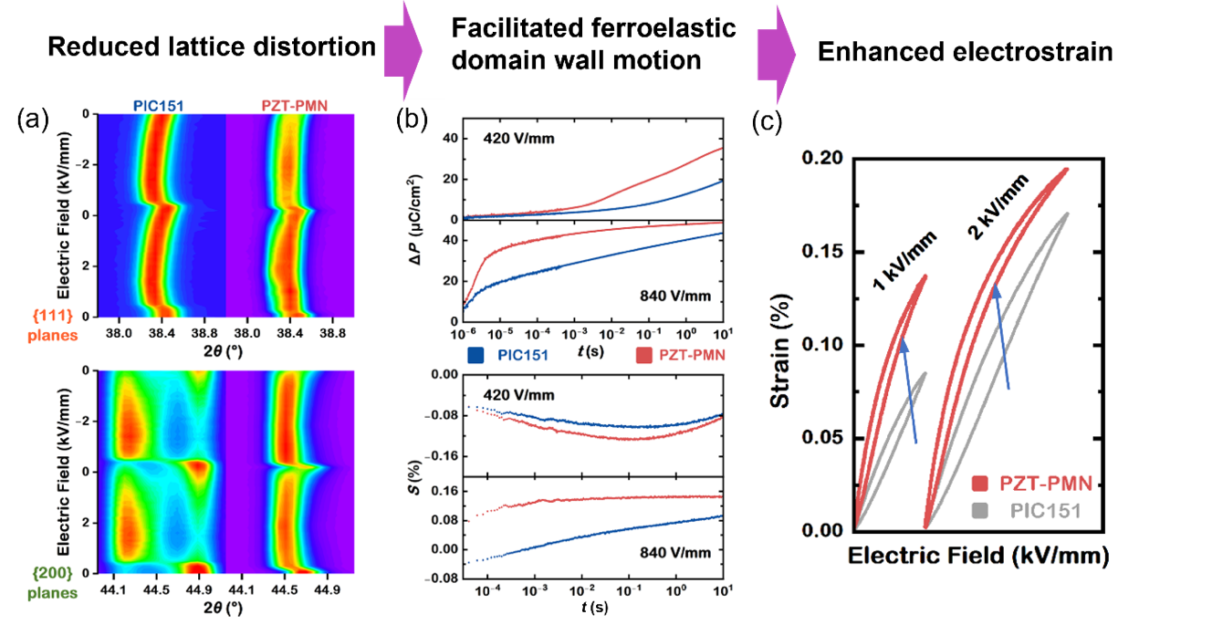 低电场下大应变形成机制示意图:(a)PIC151商用陶瓷样品与PZT-PMN复合压电陶瓷的电场原位同步辐射结构表征结果,表明弛豫型PMN的固溶减小了PZT基体的晶格畸变;(b)两种样品在亚微秒时间分辨下的畴翻转动力学分析,证明PZT-PMN中的铁弹畴畴壁移动更容易;(c)两种样品的电致应变曲线,PZT-PMN在低电场下展现出大幅提升的电致应变。