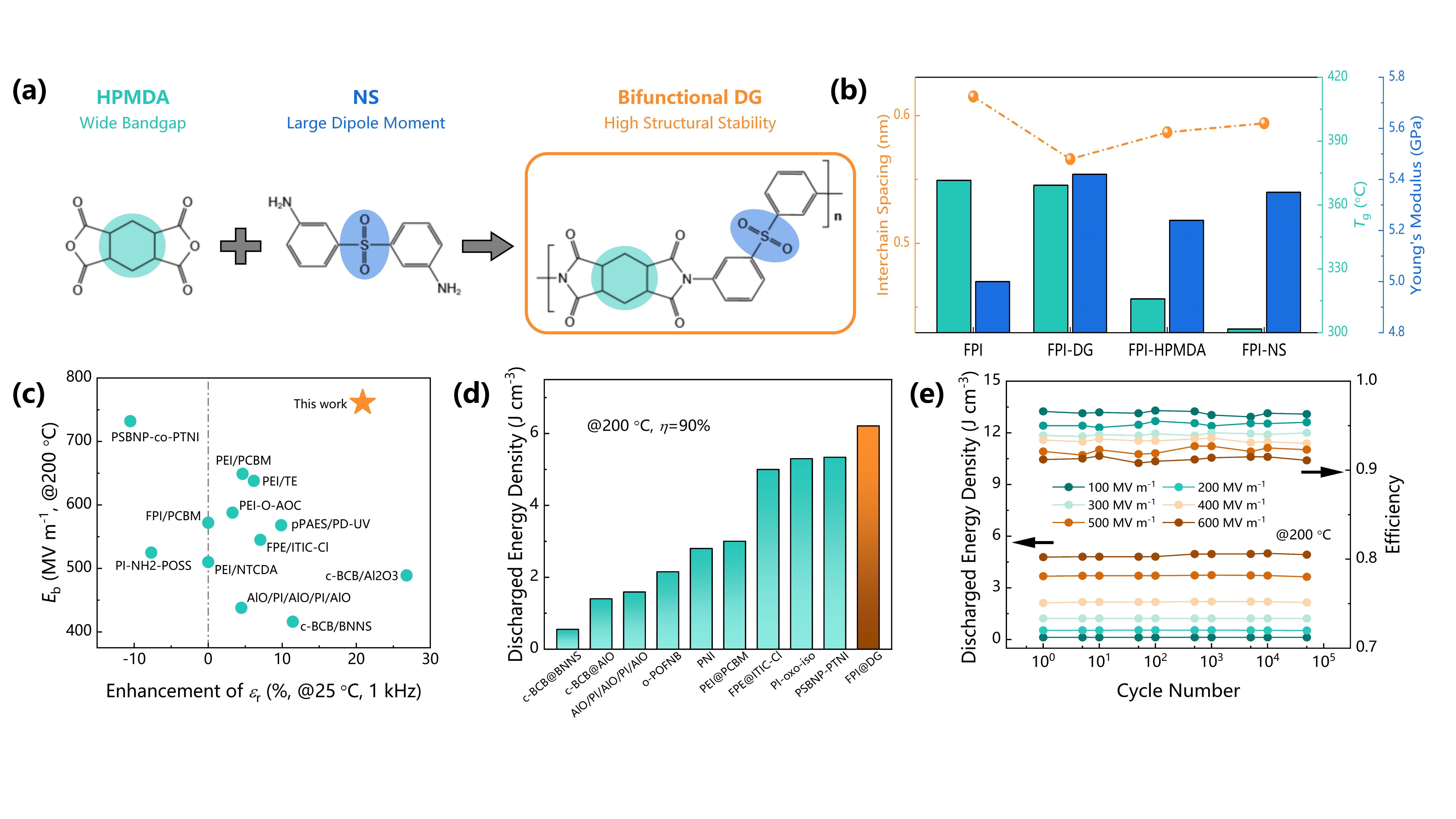 双官能团偶极玻璃-聚酰亚胺共混电介质的结构与性能:(a)双官能团偶极玻璃的合成示意图(b)共混电介质的链间距、玻璃化转变温度和杨氏模量(c)共混电介质的介电常数和击穿场强与其他文献的比较(d)共混电介质的高温能量密度与其他文献的比较(e)共混电介质的高温充放电循环稳定性