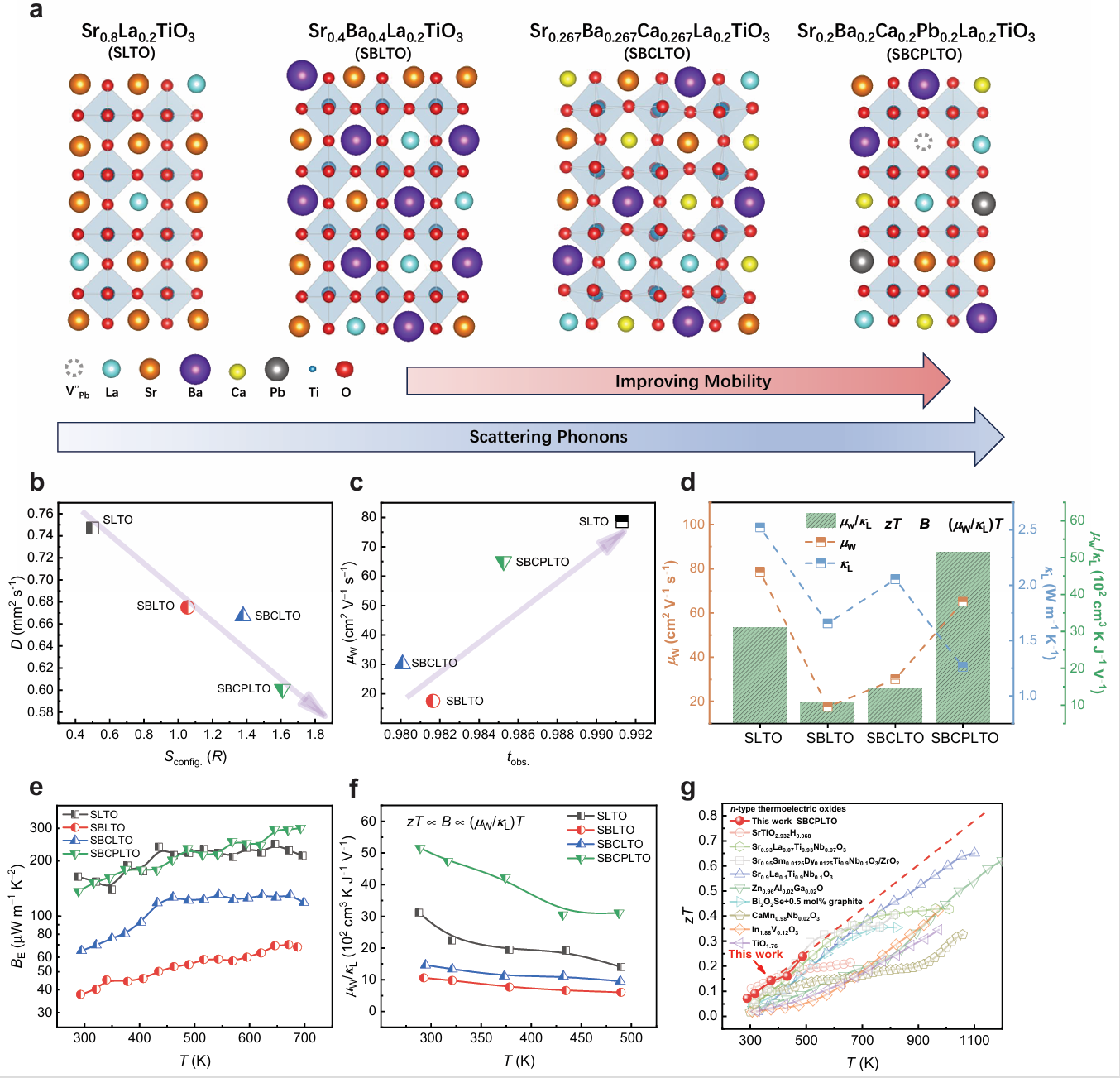 总结来看,由于钛酸锶基钙钛矿(ABO3)中A位主要影响声子声学支和低频光学支,因此A位固溶多种元素对于热传输有着显著散射,结合熵引入的位错和应变,样品的热扩散系数D随着熵Sconfig.增大而降低;另一方面,钛酸锶基体系的电学性能由TiO6八面体决定,因此,不对Ti位进行元素固溶,并通过调控A位元素平均尺寸从而影响钙钛矿结构容忍因子的方式,可以调控材料的Ti位移和电输运性能。容忍因子越接近1,样品的迁移率越高。总而言之,通过熵工程设计时的分位置调控和元素合理选择,本工作在钛酸锶基体系中成功实现了电热输运解耦和高的热电性能(图4)。