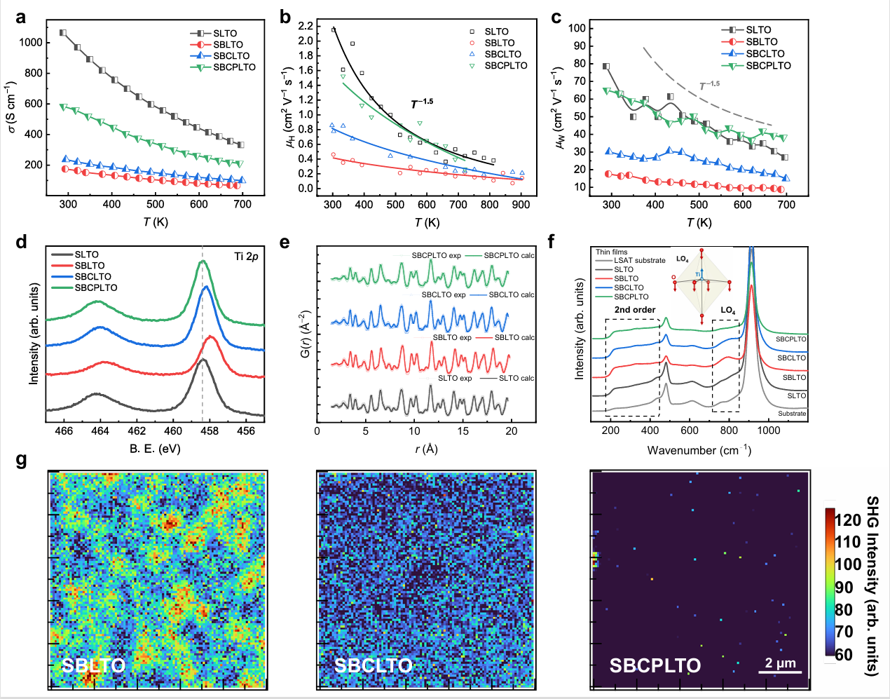 电输运方面,从中熵的(Sr0.4Ba0.4La0.2)TiO3到(Sr0.27Ba0.27Ca0.27La0.2)TiO3再到高熵的(Sr0.2Ba0.2Ca0.2Pb0.2La0.2)TiO3,随着熵的增大,虽然声子的散射在不断增强,但是样品的迁移率呈现上升的趋势,展现出电热输运解耦的现象。通过X射线光电子能谱(XPS)、同步辐射对分布函数(PDF)、拉曼表征、二次谐波表征(SHG)可以推断,熵增大时迁移率的提升,可能和TiO6八面体中Ti的位移有关(图2)。