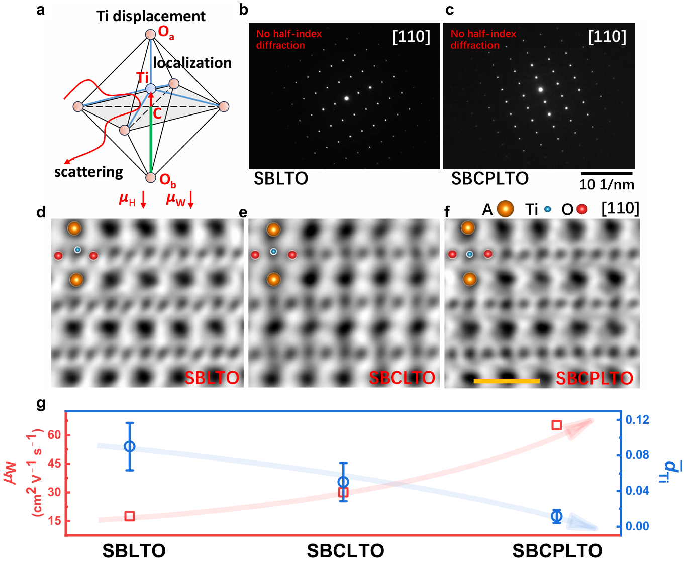 更进一步,通过球差校正电镜观察Ti的位移,本工作尝试建立了Ti的位移和加权迁移率μW之间的关系。从环形明场像(ABF)中可以统计得出,随着Ti偏心位移的减小,样品的加权迁移率增大。再结合选区电子衍射(SAED)和ABF对于TiO6倾转的观察,发现倾转和迁移率变化的关联并不紧密。考虑到Ti位移可能导致轨道的劈裂和电子的局域,加之以不规则的Ti位移导致的电场起伏对电子的散射,可以推断Ti的位移减小是熵增大过程中样品迁移率提升的主要原因(图3)。