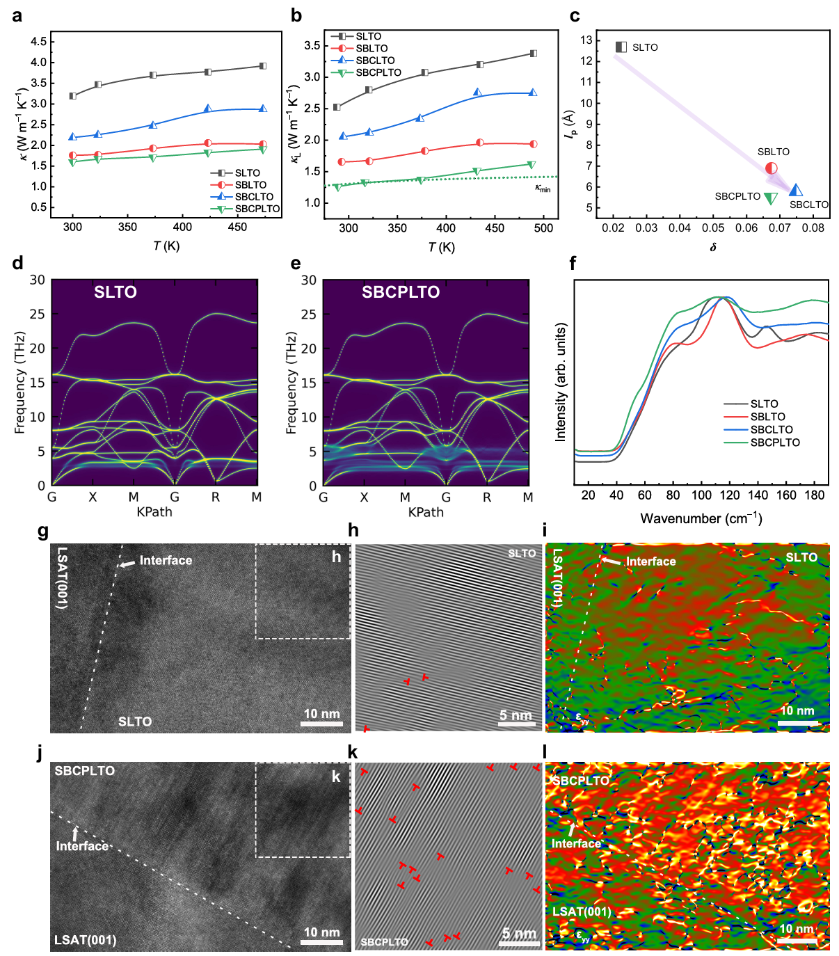 热输运方面,随着熵的增大,热导率数值整体上呈现下降趋势,并在高熵(Sr0.2Ba0.2Ca0.2Pb0.2La0.2)TiO3样品中达到了近非晶极限。究其原因,本征角度,熵引入的元素尺寸波动和质量波动显著增强了声子散射。非本征角度,熵所稳定的高密度位错和强烈的应变,也是散射声子的重要来源(图1)。
