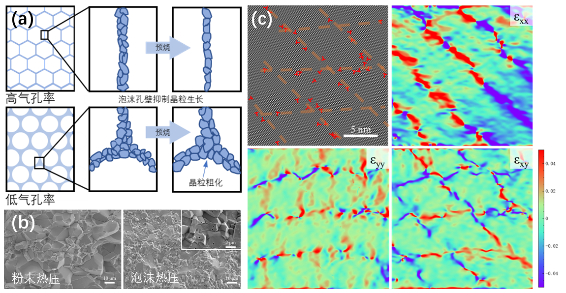 (a)泡孔壁抑制大晶粒生长示意图;(b) FPC工艺和传统工艺制备的氧化铝陶瓷断口对比;(c) 高分辨透射电镜图像中的局部位错和几何相位分析应变分布