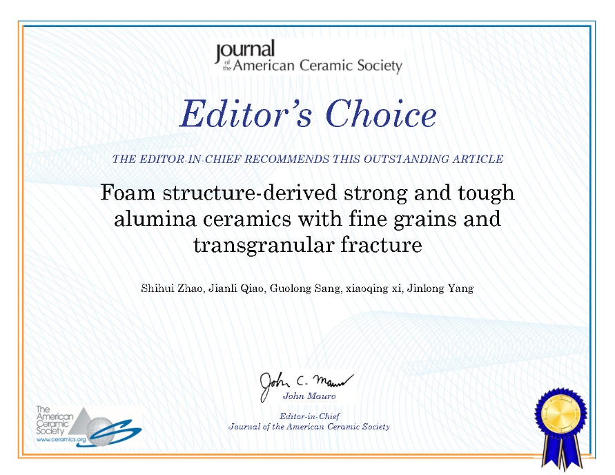该工作的研究成果以“Foam structure-derived strong and tough alumina ceramics with fine grains and transgranular fracture”为题发表在《美国陶瓷学报》(Journal of the American Ceramic Society)上,被评为2024年美国陶瓷学会会刊的“编辑精选”(Editor’s Choice)内容。《美国陶瓷学会会刊》是陶瓷领域的顶尖期刊之一,2024年共有39篇论文被评为“编辑精选”。编辑团队会根据文章的创新性、科学严谨性、研究的重要性以及对陶瓷领域可能产生的广泛影响等多个维度进行评估。这些文章代表了陶瓷领域的前沿研究成果或者是对传统陶瓷问题的新颖解决方案,并为后续的研究提供了重要的参考方向。