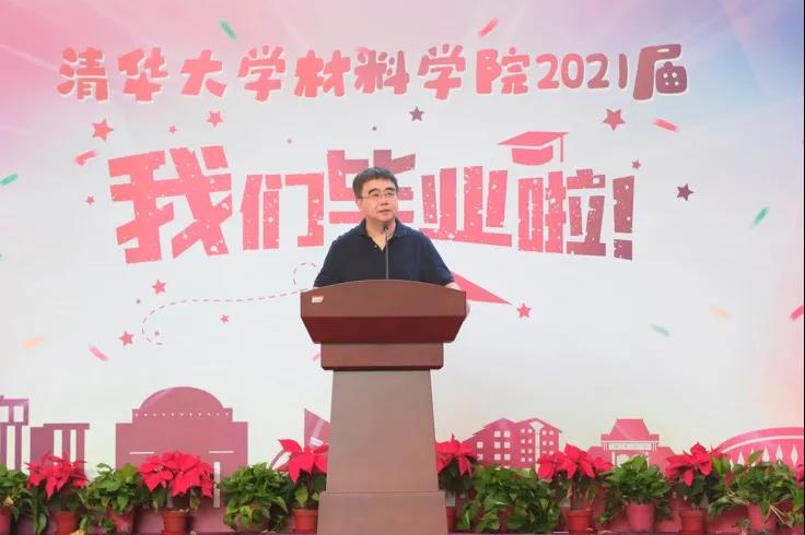 紧接着,中国工程院院士周济老师作为教师代表为同学们送上临别寄语。首先,周老师祝贺全体毕业生在清华园走过这段风雨兼程的青葱岁月,破茧成蝶,顺利毕业!随后,周老师用三个关键词与大家共勉:一是天命。个人命运与时代息息相关,个人天命与时代同频共振。站在“两个一百年”奋斗目标的历史节点,材料科技举足轻重,材料人生逢盛世,毕业之际恰逢风起之时,祝愿大家展翅高飞;二是情怀。在人生道路上,情怀能够给予超凡的勇气、潜能和力量。希望大家坚守情怀,珍惜情怀,努力成长为百年后青年人的榜样;三是本色。世界因个人本色而绚烂多彩,个体因保持本色而超凡脱俗,社会因独立精神而充满能量。希望每一位毕业生保持本色,在人生底色上描绘属于自己独一无二的人生画卷。最后,周老师希望大家不忘天命,珍惜情怀,保持本色,乘风而起,飞得更高更远;历经千山万水,归来仍是少年。