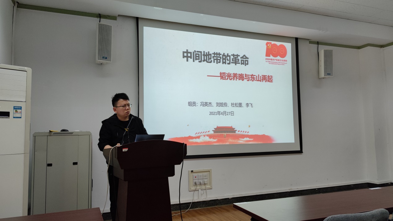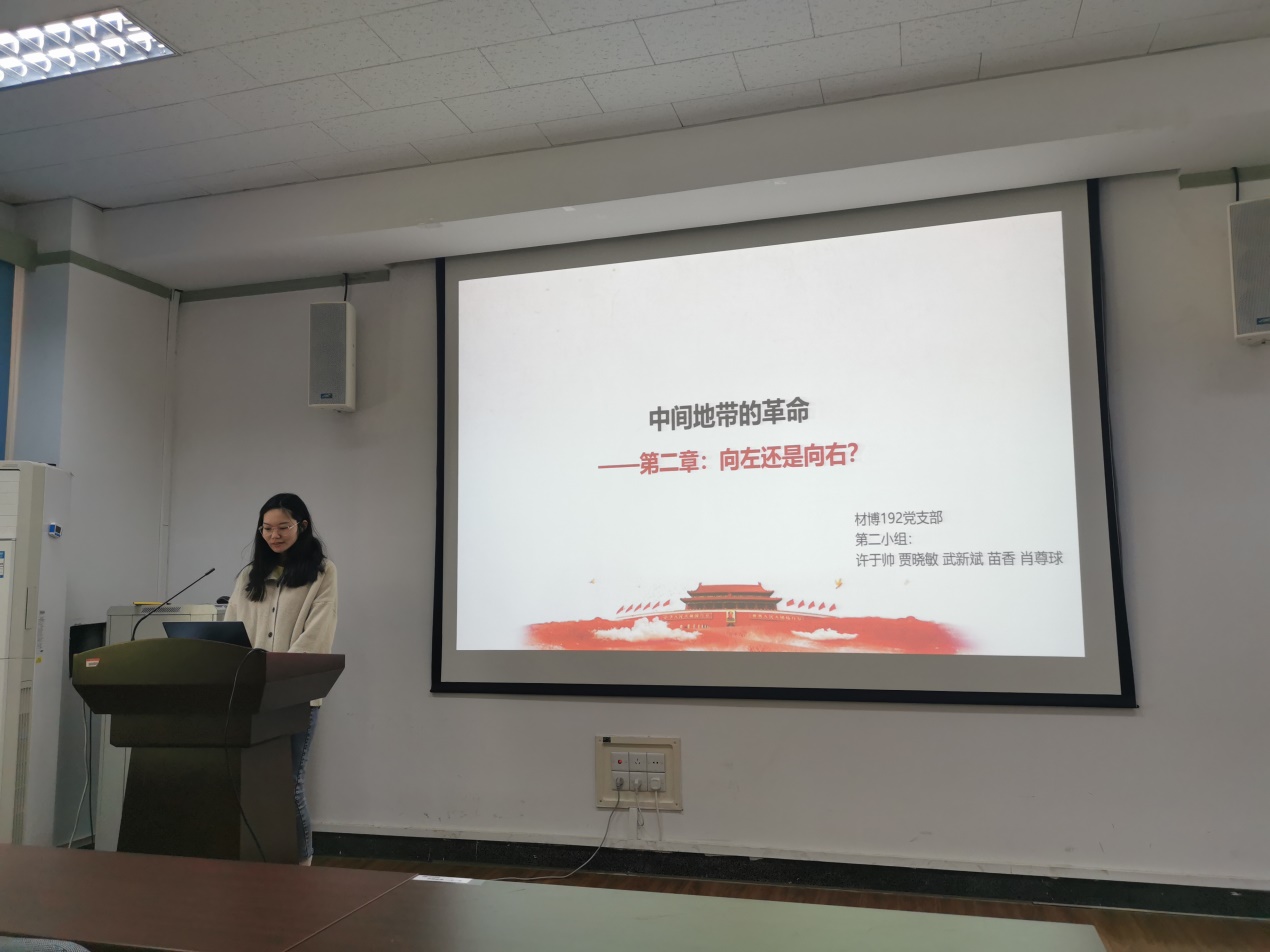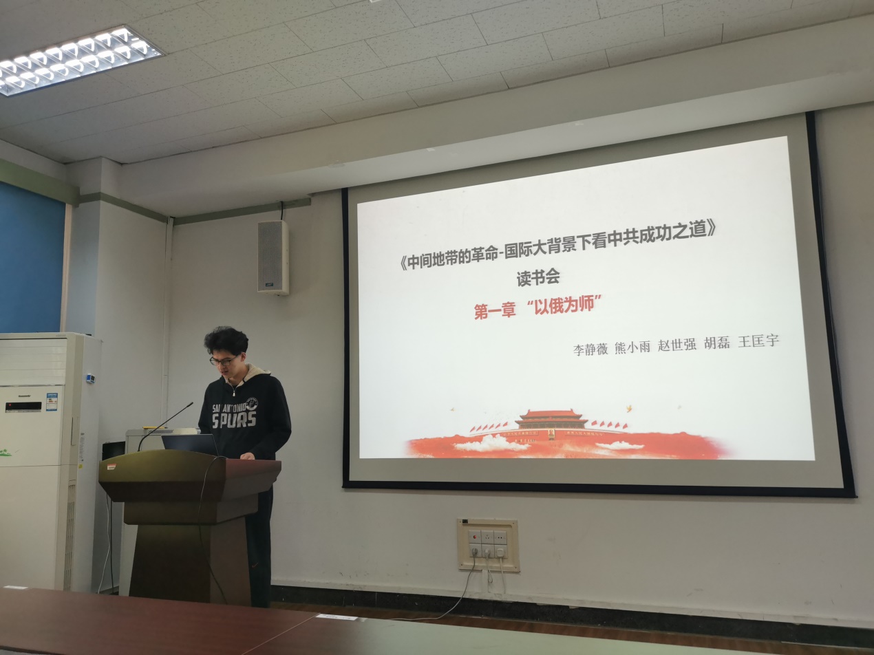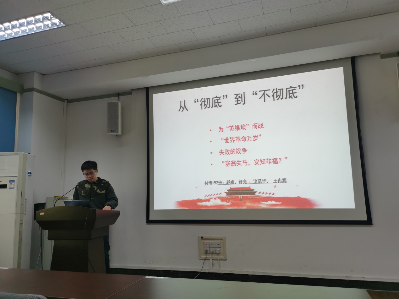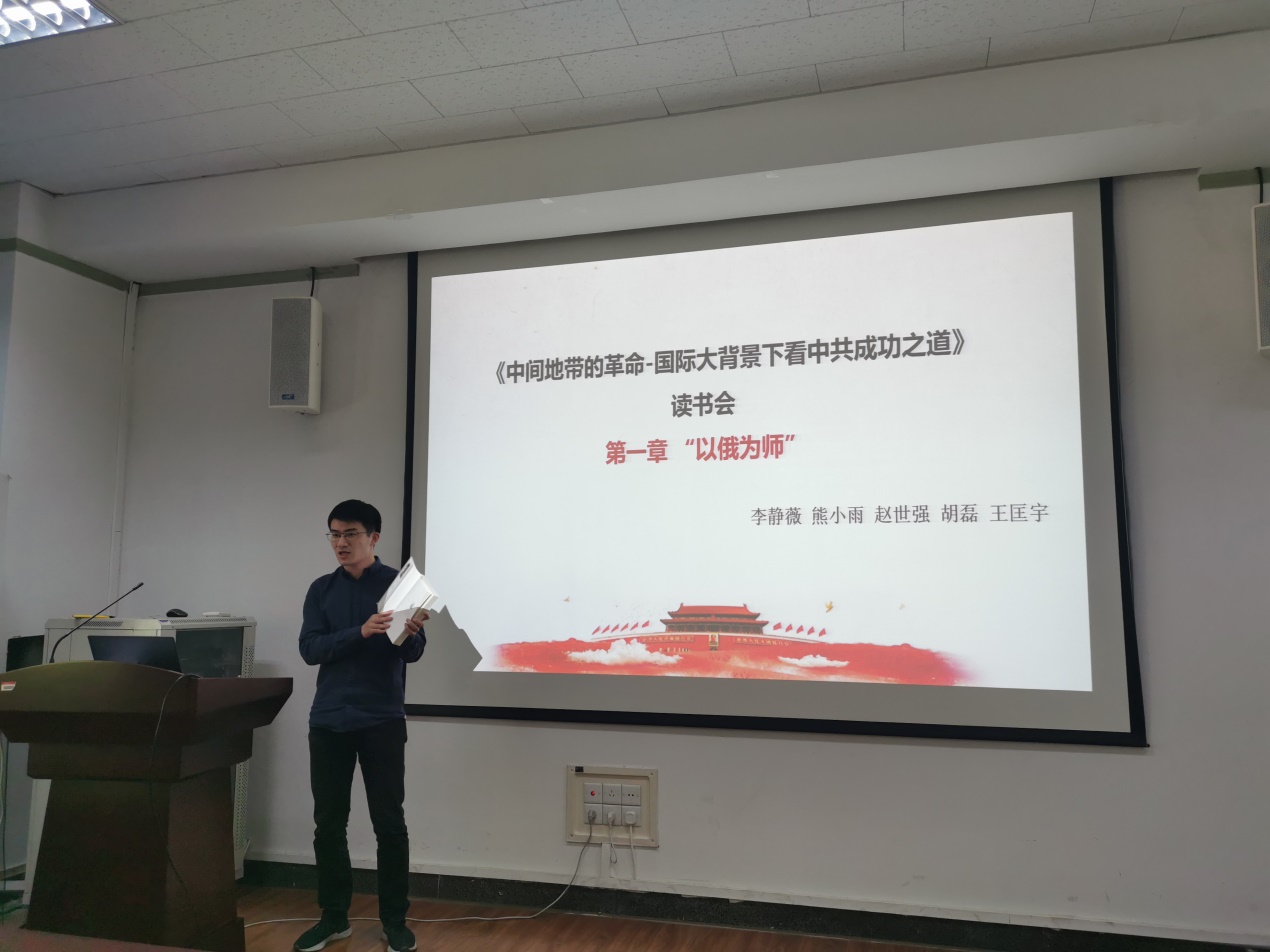 首先,材博192党支部的王匡宇同志对第一章“以俄为师”进行阐述,对中国共产党的诞生的原因进行了分析,并对“以俄为师”的利弊进行分析。第一次世界大战和俄国的十月革命是中国共产党诞生的重要原因,第一次世界大战激起了中国人强烈的民族情绪;俄国十月革命的成功激励知识分子开始动员民众起来革命。“以俄为师”有利有弊,但对中国现代历史和国际政治的演进有着重要的意义,对中国现代历史来说,导致了国民党和共产党的迅速发展壮大,导致了轰轰烈烈的国民大革命,意味着中国革命从这时真正开始;对国际政治的演进而言,俄国人介入中国革命的过程,恰恰是列宁主义逐渐从西方移向东方,在最适宜其生长的条件下生根、开花、结果的过程。