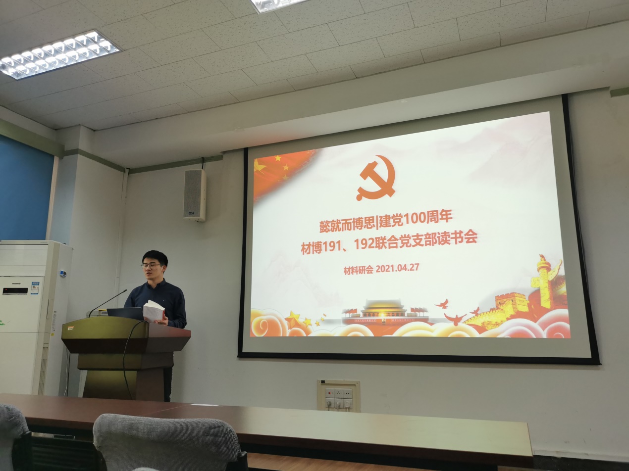 4月27日,yl88858永利集团材博191、材博192联合党支部在逸夫技术科学楼A205召开“懿就而博思——建党100周年材博191、192联合党支部读书会”,材博191、材博192联合党支部全员参与。首先由材博192党支部书记胡磊同志介绍本次读书会。随后材博191、192党支部成员分别对《红星照耀中国》《中间地带的革命》两本红色书籍进行解读分享,最后同学们就两本书籍展开了讨论。材博192党支部书记胡磊主持本次会议。