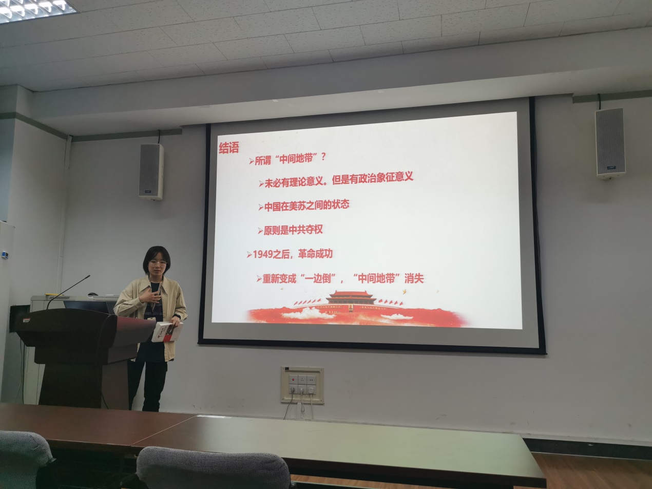 最后,惠可臻同志就“走向新中国”进行分享,并总结全书。在反法西斯战争结束之际,困扰着中国共产党人的一个重要问题就是和与战的问题,毛泽东提出“中间地带”的观点,美国要想进攻苏联,必须先征服美国人民和美、苏之间广大的中间地带(即美、苏之间的国家和人民),一切受到美国侵略威胁的国家和人民应该团结起来共同斗争。美、苏必然会通过妥协来解决他们之间的问题,但并不要求中间地带的各国人民随之实行国内的妥协,而是需要各国人民按照不同情况对各国的反动力量进行不同的斗争,只有不断地缩小各国反动力量,增强世界民主力量,发生世界大战的可能性才会越小。想通了这个问题,就已经解决了打不打的问题了。与此同时,毛泽东首次开始在思想上突破了战后大国体系的羁绊,确立了独立自主的对美战略,不再把对苏联态度及其利益的考虑放在重要位置上了,一切政策和策略的制定,都应当从中国人民反对美蒋反动派斗争的基本需要出发。