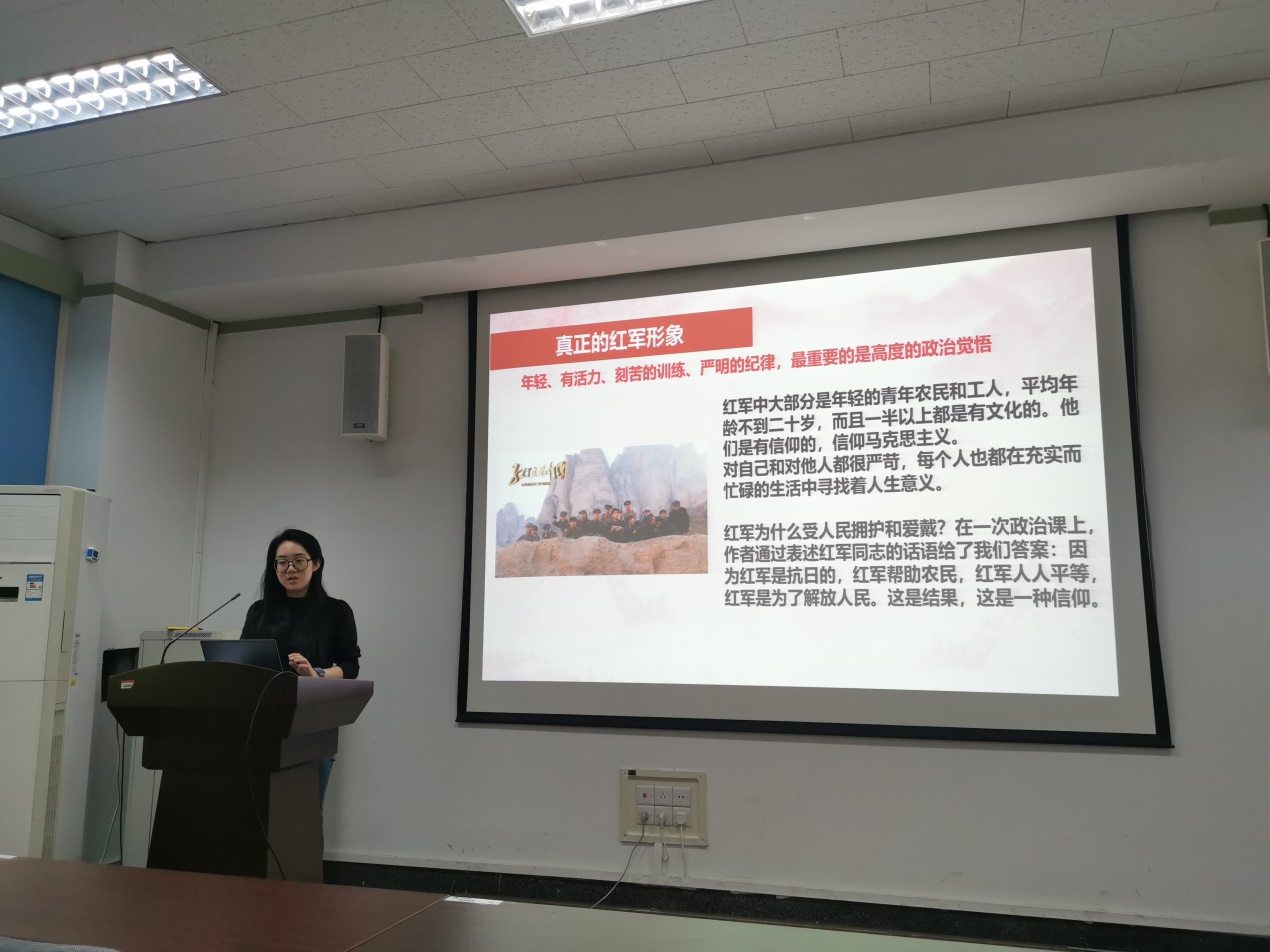 材博191的刘胜楠同志首先介绍了《红星照耀中国》的主要内容,此书记述了埃德加·斯诺于1936年6月至1936年10月,在中国西北革命根据地(即后来以延安为中心的陕甘宁边区)通过采访、对话和实地考察后的所见、所闻、所感,报道了中国和中国工农红军以及许多红军领袖、红军将领的情况。不仅是一份历史记录,而且阐明了时代的发展趋势。与毛泽东谈过话的年轻美国记者埃德加·斯诺是第一个公布长征真相的西方人,他在《红星照耀中国》里的经典性叙述,至今仍是有关长征资料的一个重要来源。接下来,她讲述了阅读第八篇“同红军在一起”的感受,讲述了对红军、对彭德怀印象的变化,红星在西北的开展是“红星”在中国大地上星火燎原的一个缩影,从起始的人民所处水深火热的社会条件,到特殊时期施行的虽简陋但极具生命力的各项政策,均有所体现。其中西北地区共产党先驱目光之长远、目标之坚定,无不令人折服。