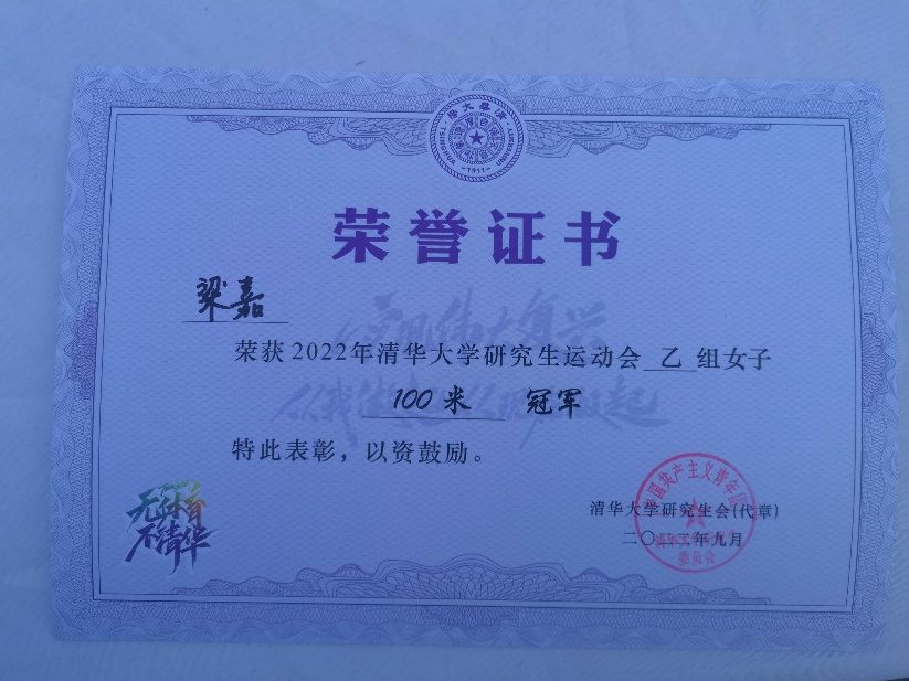 在女子乙组100米的比赛中,梁嘉先是排名第一进入决赛,在决赛中,运动健儿们奋力拼搏,梁嘉可谓一骑绝尘,以较大的领先优势获得冠军!