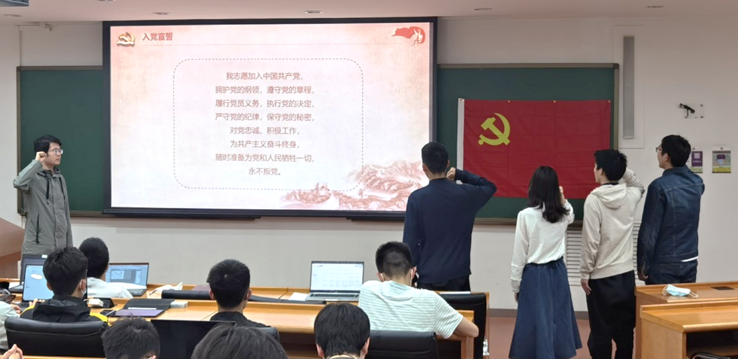 郑沐云(左一)在材9党支部发展会入党宣誓环节领誓