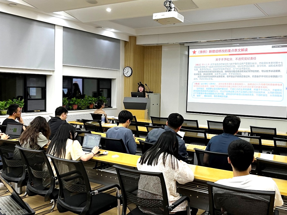 于凯新带领大家系统学习了《中国共产党纪律处分条例》。她首先回顾了《中国共产党纪律处分条例》的修订背景和历史沿革,阐明其制定和修订的重要性,并带领大家逐章逐条地学习了2023年末最新修订版本《条例》中新增或修改的重点条文。接着,她重点介绍了中国共产党第二十届中央纪律检查委员会第三次全体会议的工作报告,梳理2023年纪检监察工作成果。最后,她和大家分享了在日常生活中应该如何维护党的纪律,如何践行遵纪守法意识,通过联系实际加深同学们对党纪学习的理解。