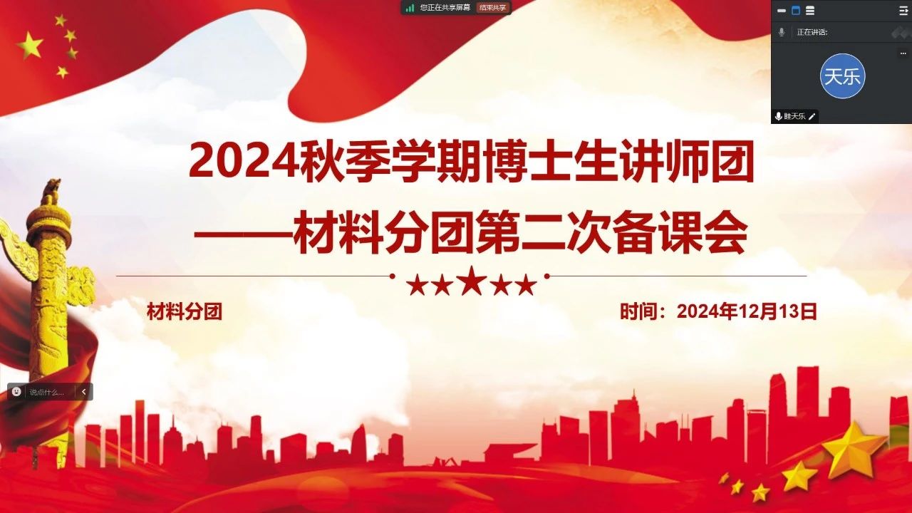 12月13日,永利集团博士生讲师团材料分团“立言计划”第八期(秋季学期)集体备课会在线上召开。yl88858永利集团研团总支书记李磊,材料分团优秀讲师赵硕、李鑫、张重阳、赵培程等人,材料分团立言计划第八期(秋季学期)学员瞿雯靓等参加。会议由材料分团团长眭天乐主持,旨在总结分团本学期的工作,并帮助立言计划学员更好准备课程。
