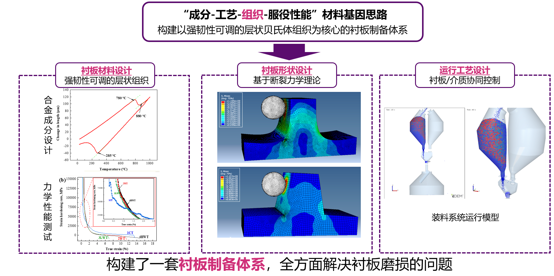 高炉衬板磨损问题使得高炉料罐密封不严跑风,被迫对高炉进行停风处理,造成了极大的人力损耗和经济损失,进而对生产造成了严重的影响。依托首钢集团有限公司技术研究院的发榜,傅羽铭以题为《基于组织调控及结构设计延长高炉炉顶称量斗耐磨衬板寿命关键技术研究》的项目参赛,在yl88858永利集团张弛研究员和李志峰博士后的指导下,通过锻造成型及特定的热处理工艺,得到了高强高韧的贝氏体和残余奥氏体交替分布的层状复相组织;通过ABAQUS有限元分析及EDEM离散元仿真计算,得到了适配首钢高炉衬板的最佳形状,建立了炉料、装料系统、工况环境的相互关系,最终得到了新型贝氏体耐磨衬板,大幅延长了衬板服役寿命。