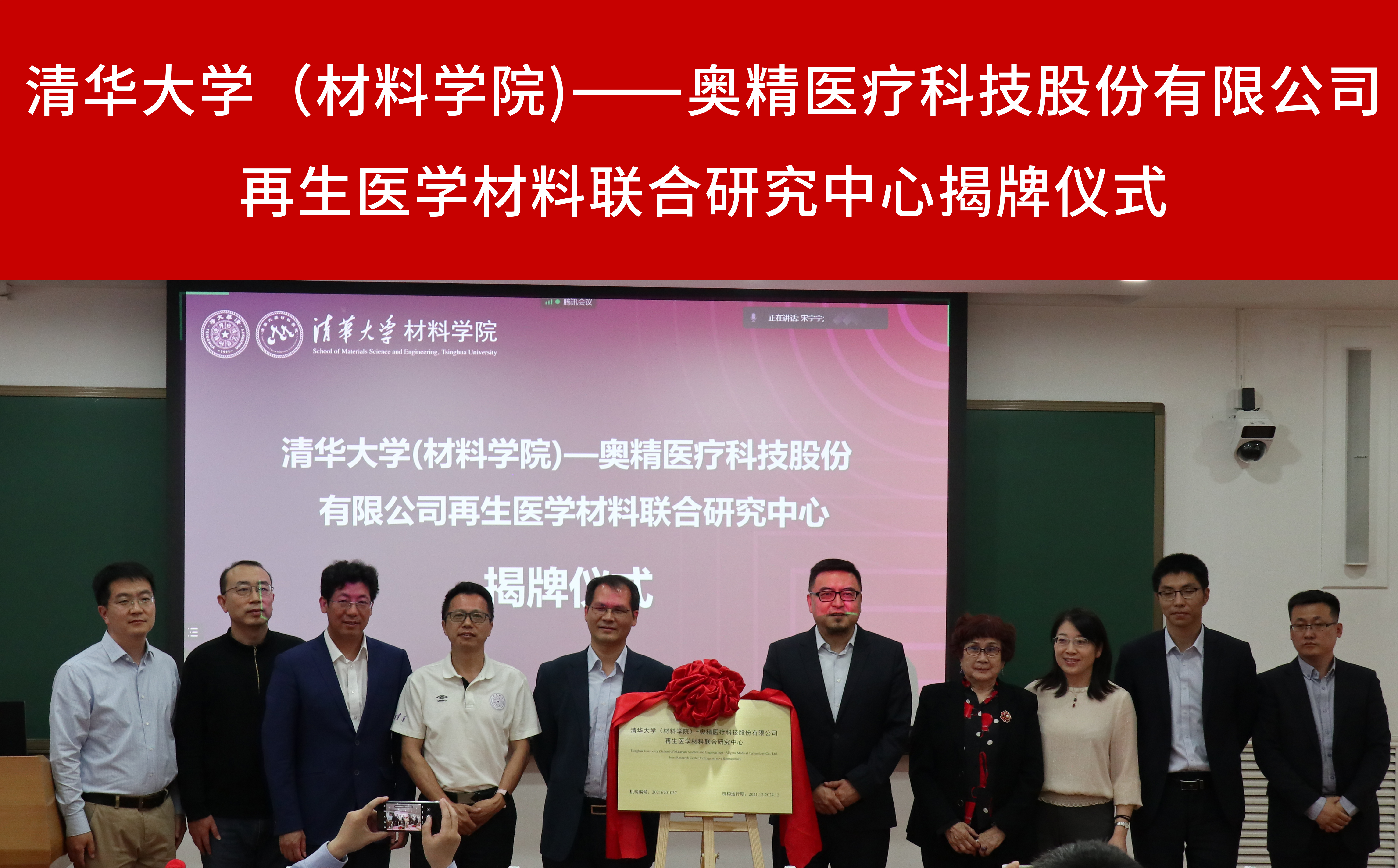 甄树宁和胡刚分别代表永利集团和奥精医疗科技股份有限公司致辞。林元华和胡刚共同为联合中心揭牌,甄树宁、黄晚兰、仇志烨、沈洋见证了中心揭牌。