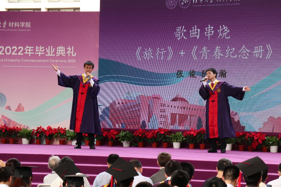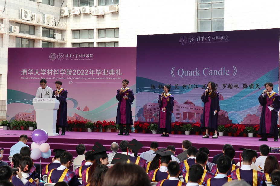 清华不仅学术氛围浓厚,校园生活也丰富多彩,我们的员工也多才多艺。八字班辅导员薛啸天带领本科生毕业生们为大家带来一首《Quark Candle 》,送别最亲爱的毕业生朋友;博士毕业生张俊、陈金瀚用两曲《旅行》和《青春纪念册》,祝愿大家踏浪扬帆、勇往直前,毕业快乐,后会有期!