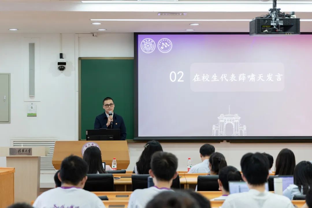 接着,在校生代表薛啸天进行了发言。他首先向全体新同学表示了热烈的欢迎。之后,他从把握科研规律,把握科学思想,把握时代使命三个方面谈了自己四年研究生经历的感悟。把握科研规律意味着从“学习知识”转变为“创造知识”,提高自己的“抗拉强度”与“杨氏模量”,做刚毅坚卓的材料人;把握科学思想意味着严谨求实,做求真务实的清华人;把握时代使命意味着立志、明德、成才、担任,做利国利民的青年人。