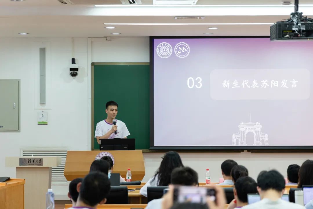 新生代表苏阳进行了发言。他谈到:刚毅坚卓,百折不挠,作为新时代的青年,我们要有奉献社会的责任担当。他将“艰苦不怕吃苦,缺氧不缺精神”的西藏精神化入血脉,更呼吁大家在清华遇见更强、更奋进的自己,成为时代洪流中顶天立地的清华人。