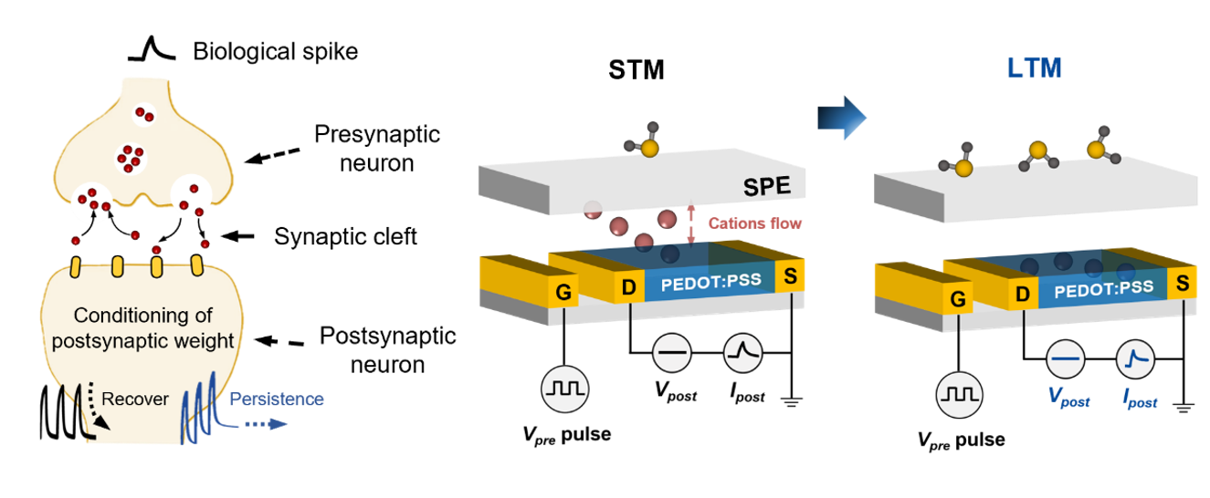 这一工作成功制备了基于全固态有机电化学晶体管的柔性仿生嗅觉突触器件,证明了由H2S介导的突触可塑性行为,包括抑制性突触后电流(IPSC),成对脉冲抑制(PPD),短期记忆(STM),长期记忆(STM),短期记忆到长期记忆的过渡(STM to LTM)。这种集成了感知和记忆能力的仿生突触电子能对有害气体的累积性损害做出预警,为未来实现模拟神经生物系统的传感和记忆功能的电子鼻提供了新的思路和策略。