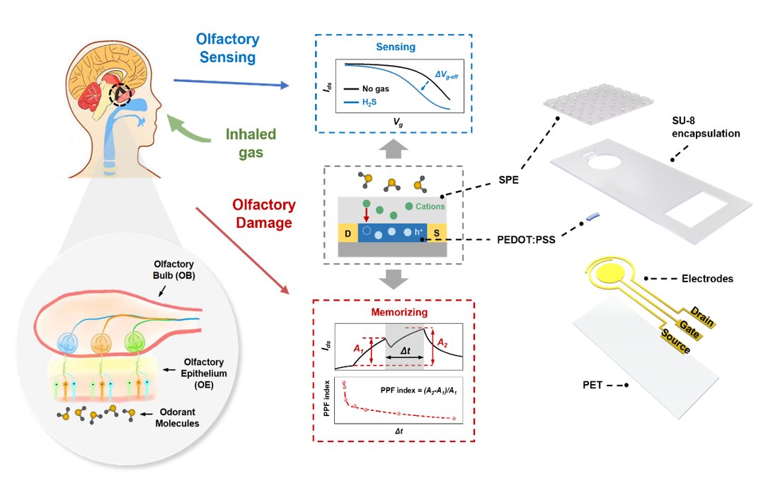 图1 基于全固态有机电化学晶体管的柔性仿生嗅觉突触的示意图