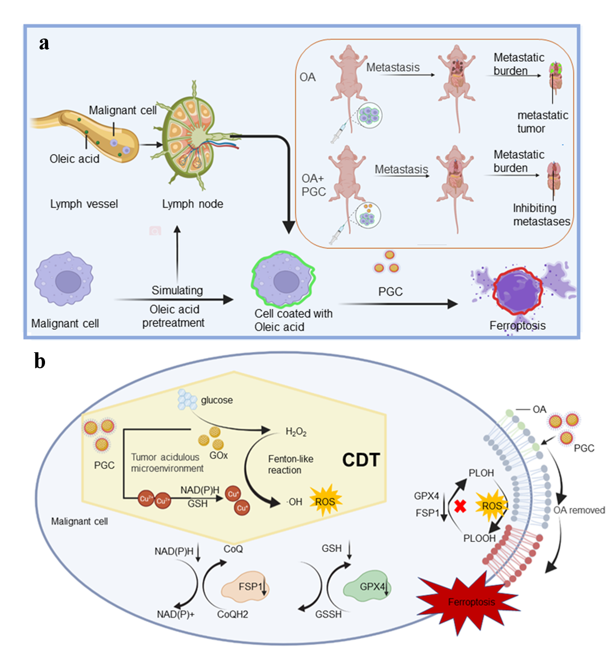 随着淋巴系统中肿瘤细胞转移的铁死亡逃逸机制被阐明。迫切需要提出一种基于铁死亡逃逸机制的治疗方式来抑制淋巴系统中的恶性肿瘤转移。细胞铁死亡是一种不同于细胞凋亡,由铁离子调控的细胞膜脂质过氧化损伤而引发的程序性细胞死亡。目前为止已知的细胞内铁死亡抑制蛋白包括经典的谷胱甘肽过氧化物酶GPX4(Glutathione Peroxidase 4)以及铁死亡抑制蛋白FSP1(ferroptosis suppressor protein 1)。肿瘤微环境的弱酸性和高浓度葡萄糖可催化PGC产生活性氧,有效靶向肿瘤。根据体外细胞实验,经过PGC处理细胞后,细胞膜中油酸比例下降,为后续肿瘤细胞铁死亡提供了先决条件。蛋白免疫印迹技术和免疫组化结果显示PGC使肿瘤细胞中GPX4和FSP1蛋白水平下降,阻断了GPX4与FSP1铁死亡抑制机制,诱导细胞铁死亡。以黑色素瘤小鼠为模型,对比对照组,注射PGC后小鼠转移灶明显减少,存活率提高,证明了PGC在抑制肿瘤转移的有效性。
