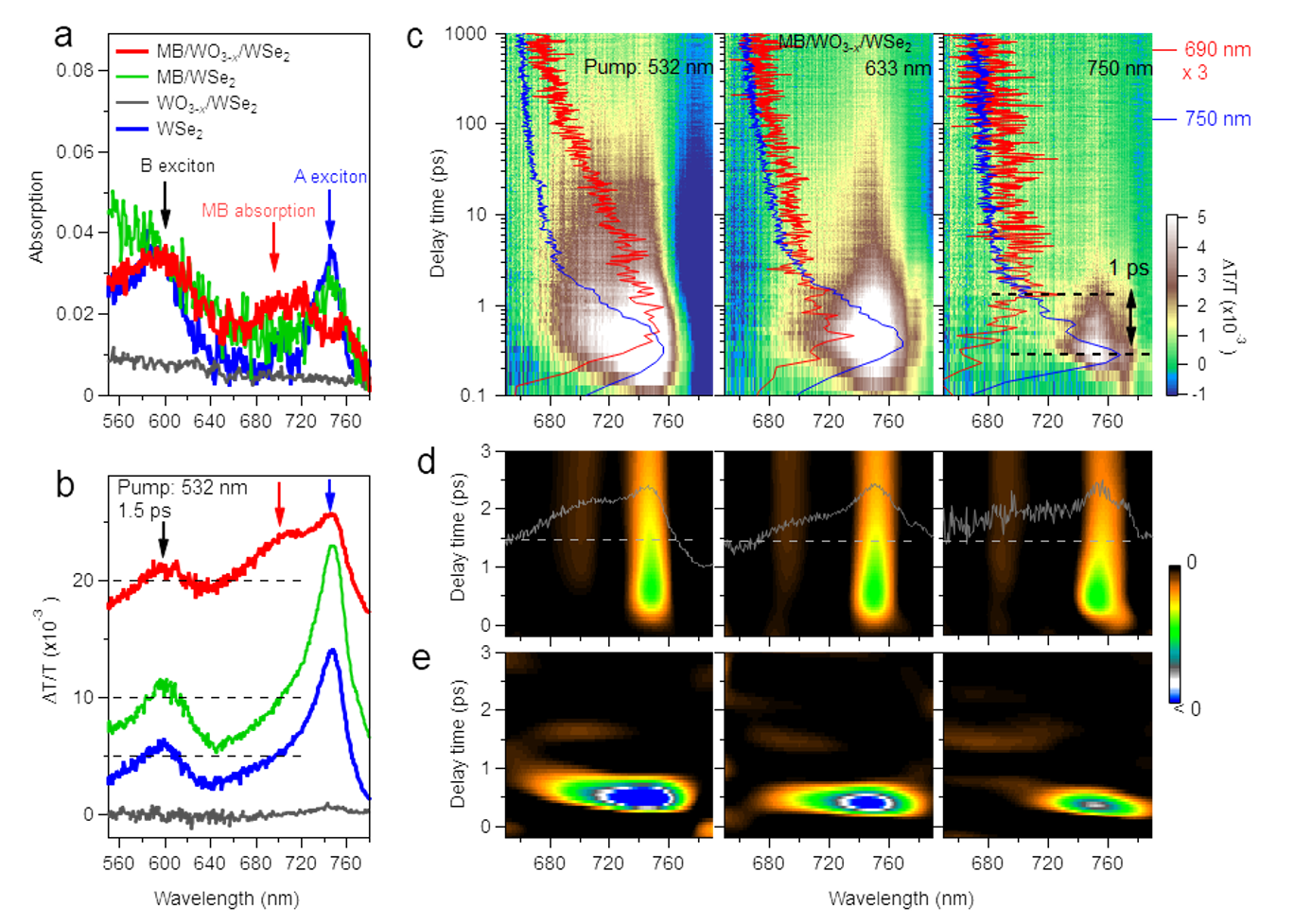 图4.1D/2D WO3-x/WSe2异质结材料和甲基蓝(MB)分子间的超快瞬态吸收光谱