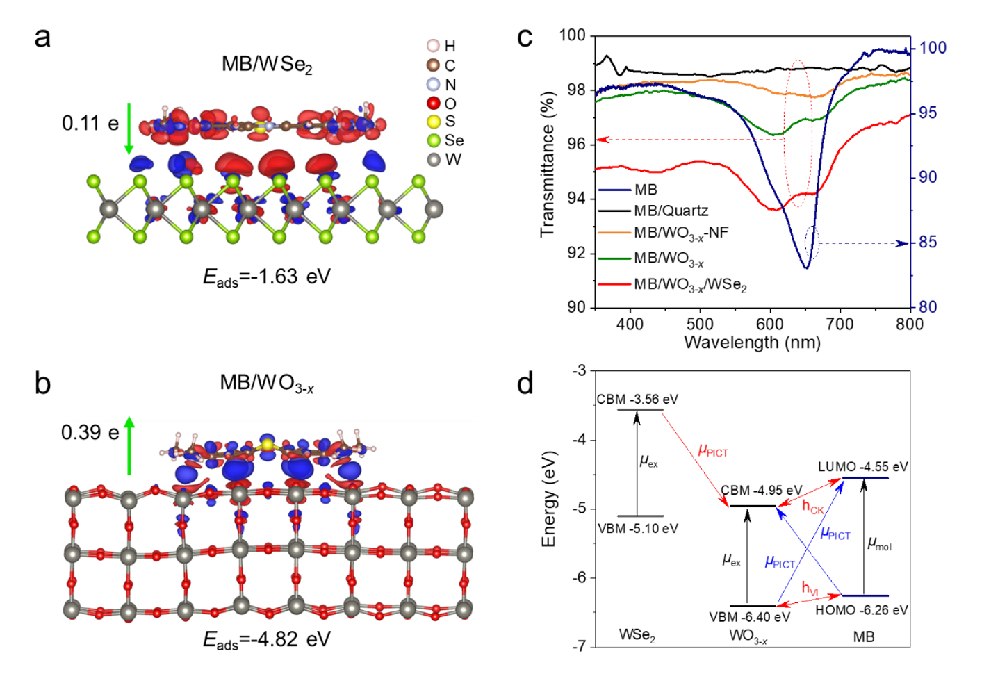 图3.1D/2D WO3-x/WSe2异质结增强机制的理论计算分析