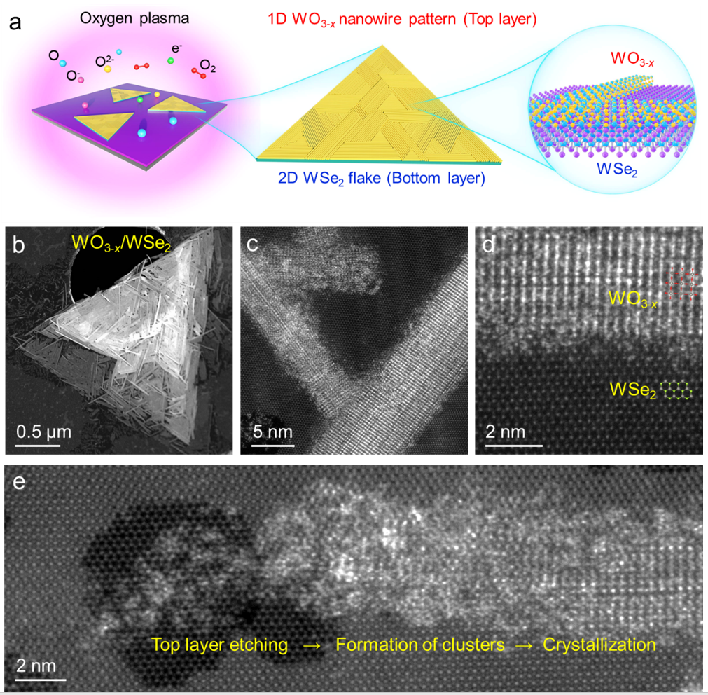 为解决上述难题,研究团队采用常压化学气相沉积(AP-CVD)工艺合成了单层和少层WSe2,采用氧等离子体后处理成功合成了WO3-x纳米线/WSe2的混合维度异质结。其中,WO3-x纳米线沿着底层WSe2的三重对称方向择优排列(图1)。
