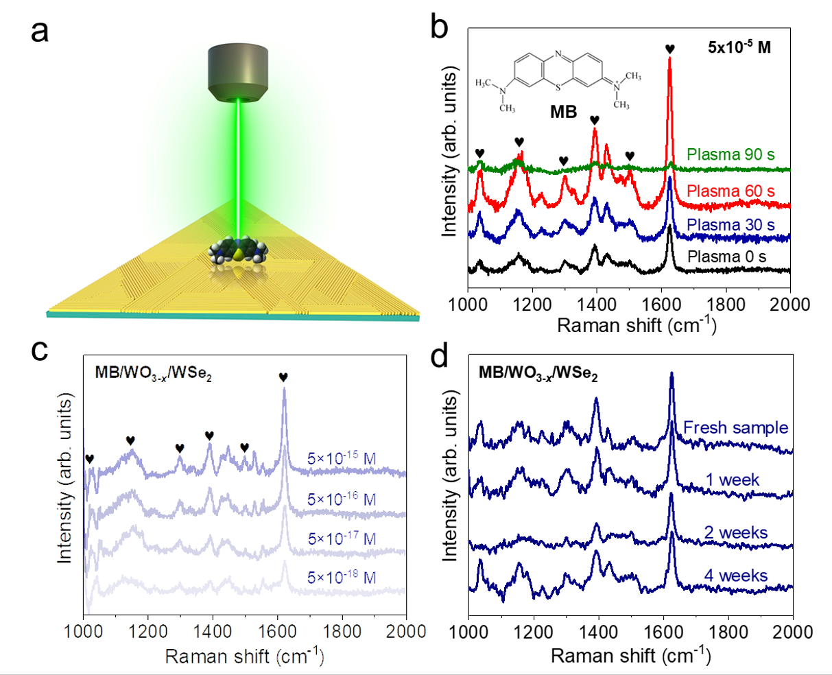 SERS性能研究表明(图2),在不同等离子体处理时间下,当WSe2被完全氧化为WO3-x时(处理时间60s),在其表面可激发最强的分子拉曼信号。该处理时间制备的混合维度异质结具有超高的探测灵敏度,并具有良好的空气稳定性。
