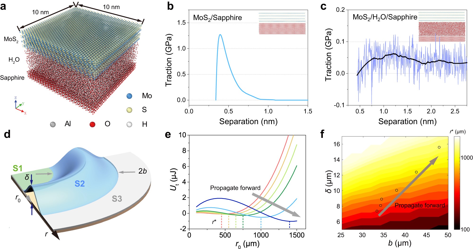 图4.界面作用的分子动力学(MD)模拟和SWLB的理论建模。(a)MD模拟所采用的原子模型。(b-c)MD模拟得到的MoS2/Sapphire和MoS2/H2O/Sapphire体系的拉力-位移曲线。(d)SWLB理论模型的示意图,其中S1为已传播区域,S2为鼓泡区域,S3为未传播区域。(e)根据理论模型计算得到的不同截面轮廓下SWLB总能量与其曲率半径的关系。(f)理论模型预测得到的不同截面轮廓SWLB的终态平衡位置