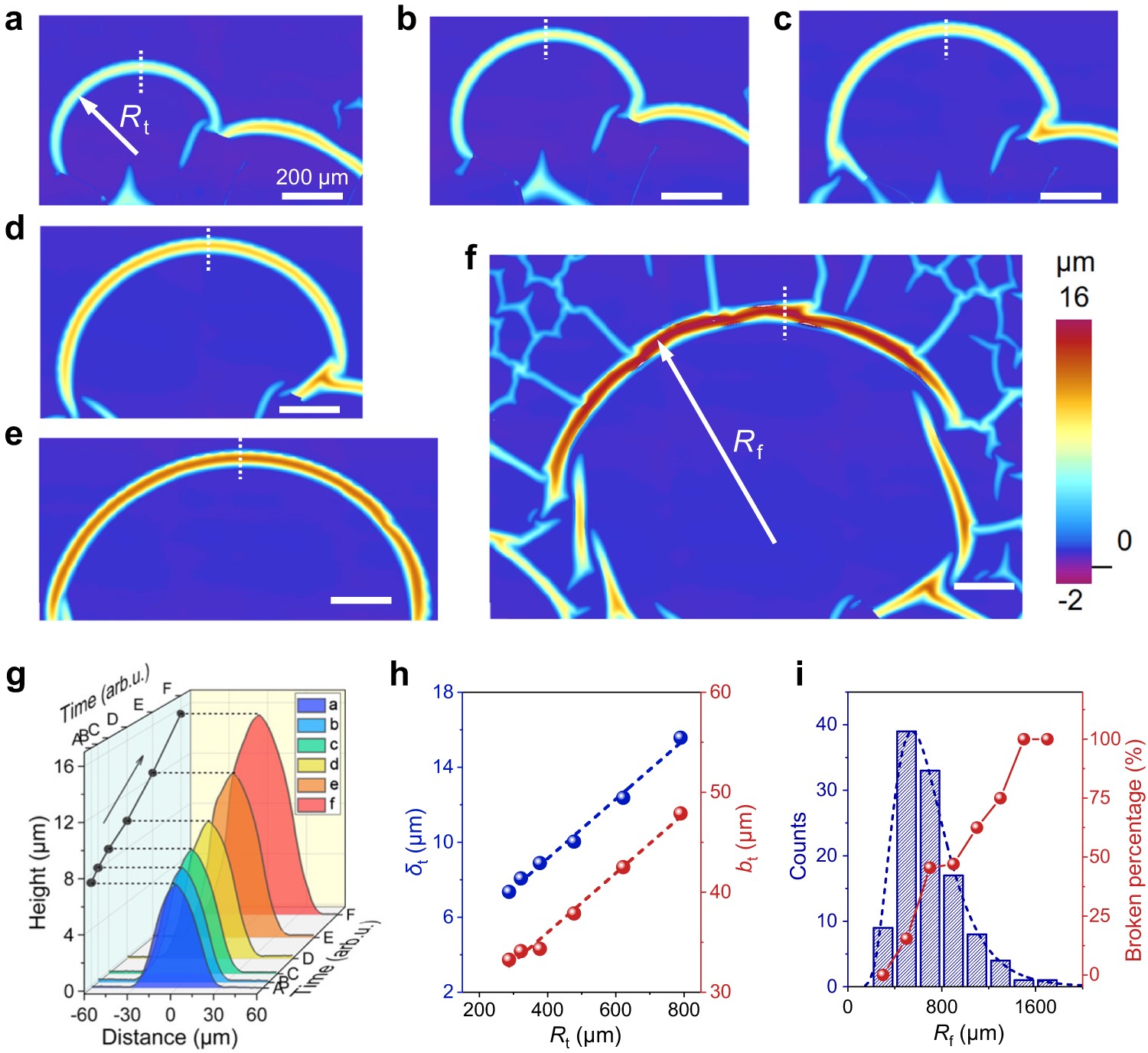 图2.SWLB扩展过程中的三维形貌变化。(a-f)传播过程中不同时刻SWLB的三维轮廓图,其中Rt是t时刻的瞬态曲率半径,Rf是最终的终态曲率半径。(g)不同时刻SWLB中心区域的截面轮廓,测量位置是图(a-f)白色划线区域。(h)SWLB的瞬态高度δt、瞬态半宽度bt和瞬态曲率半径Rt之间的关系。(i)终态曲率半径Rf的统计分布以及断裂鼓泡比例随终态半径Rf的变化规律