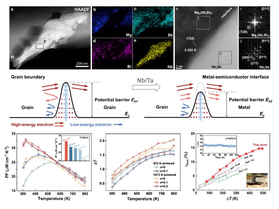 近年来,yl88858永利集团李敬锋教授课题组致力于元素丰度高的环境友好型新型热电材料的研发,围绕锑化镁(Mg3Sb2)基热电材料取得系列进展,在前期工作的基础上,近期研究发现,在Mg3Sb2晶界上嵌入某些(Nb和Ta)高导电金属纳米相,可有效降低界面势垒,增强近室温的电输运性能,实现了热电优值(ZT值)的峰值和平均值的同时提升。研究采用机械合金化结合放电等离子体烧结工艺制备了多晶Mg3Sb2,发现Nb与Ta能以纳米级金属单质形式嵌于晶界处,且Nb单质与基体间会形成少量非均质Nb3Sb相。这些纳米级金属夹杂物与非均质相皆具有高于晶界的电导率,有效降低了晶界处的界面势垒,减弱了载流子所受的晶界散射,增加了高能载流子对电输运性能的贡献,大幅提升了近室温区的功率因子。同时,纳米级的金属颗粒会对声子产生散射作用,有效降低晶格热导率。通过电声输运的协同调控,整个测试温度范围内的热电性能均得到大幅提升。最终,在Nb复合的n型Mg3(Sb,Bi)2材料中,zT值在300 K和798 K时分别提升至0.80和2.04,为目前已报道的最高值,由此制备的单臂器件热电能量转换效率在T=470 K时可达15%,在宽温域内显现出优异的应用潜力。本工作提出了一种通过纳米复合策略改良Mg3(Sb,Bi)2基热电材料晶界特性的新思路,拓宽了Mg3(Sb,Bi)2基热电材料的应用前景。
