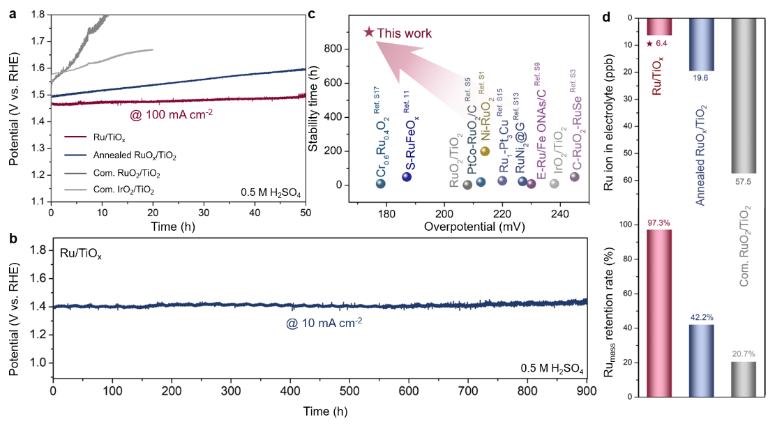 图2.Ru/TiOx在0.5 M H2SO4中的OER稳定性