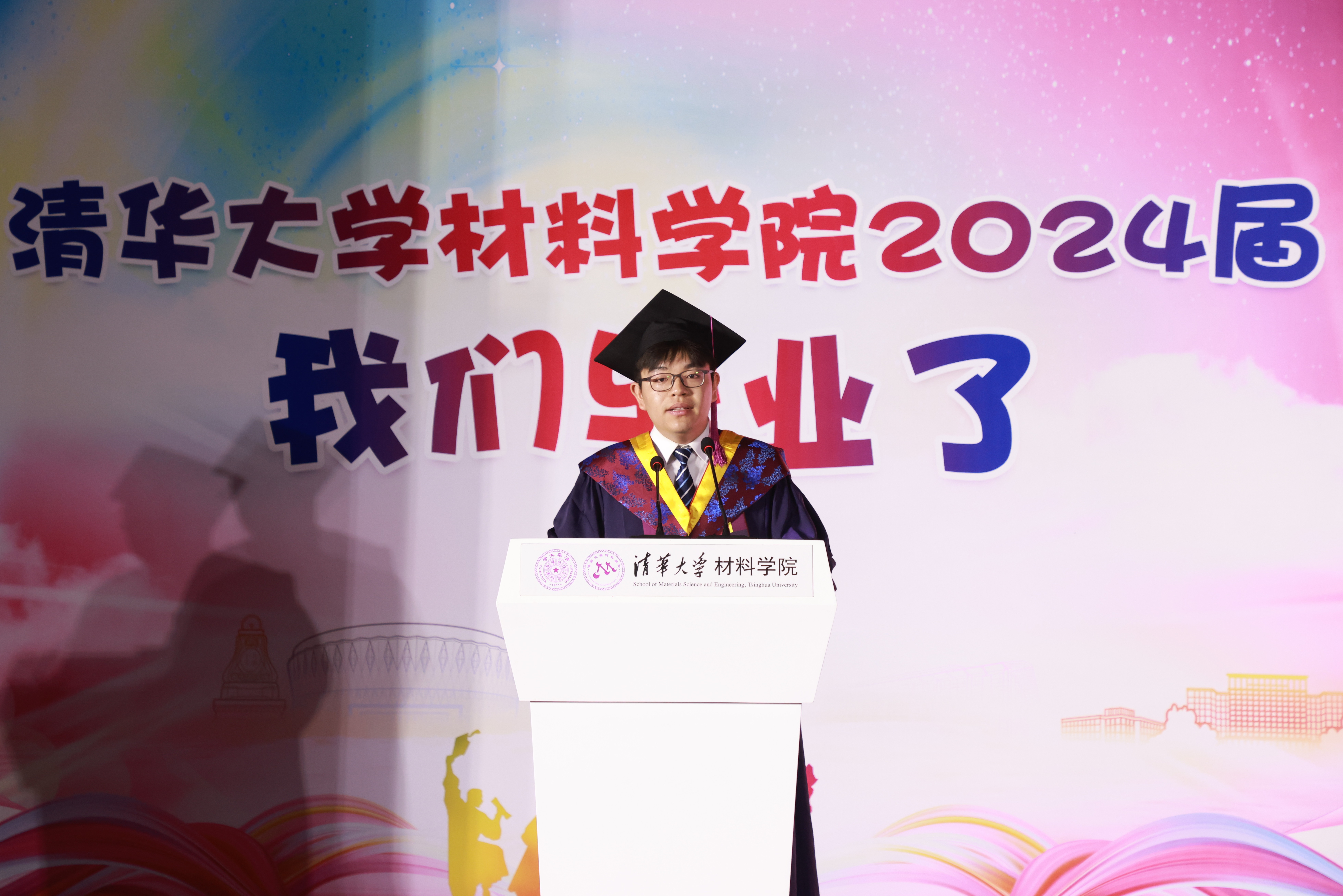 靳增晖代表全体毕业生发表感言。他首先向公司的老师、辅导员及亲友们表达了诚挚的感谢,感谢他们四年来的指引与支持。他特别提到,这届员工中有80%来自农村或县城,通过自强计划或国家专项计划考入清华,他自身也是其中之一。初入清华时,面对快节奏的生活和高强度的竞争,曾感到迷茫与不安。但在老师的引导下,学会了如何“破局”,找准定位,逐步适应并成长。四年间,员工们秉持“自强不息”的精神,珍惜学习机会,积极参与各类实践活动,不断提升自我。从图书馆到社会实践,从员工会到科研项目,多点开花,全面发展。如今,员工们已成长为可以独当一面的骨干,并在公司转书院培养的背景下,积极承担社工骨干和辅导员的职责,发扬材料学子的优良传统。他鼓励同学们继续前行,在新的征程中再创辉煌。