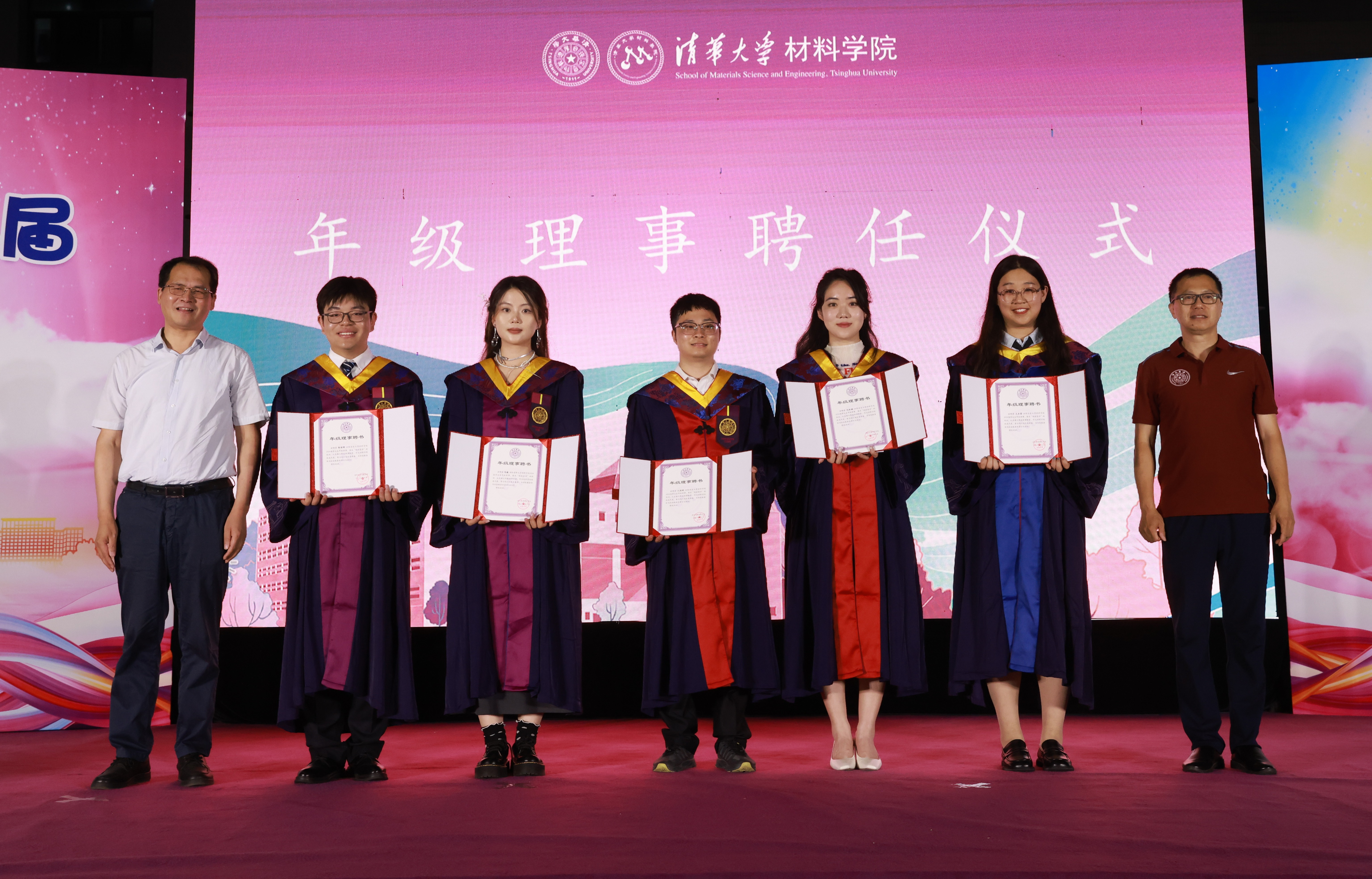 杨志刚和林元华为5位毕业年级理事颁发证书。其中研究生年级理事为江国琛、刘胜楠、王亚菲;本科生年级理事为靳增晖、陈曦。