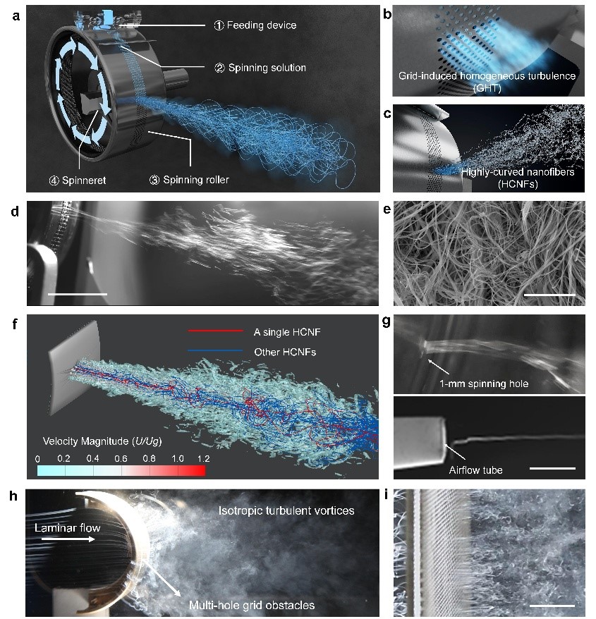 图2.格栅诱导的均匀湍流制备高度卷曲超细纤维材料过程