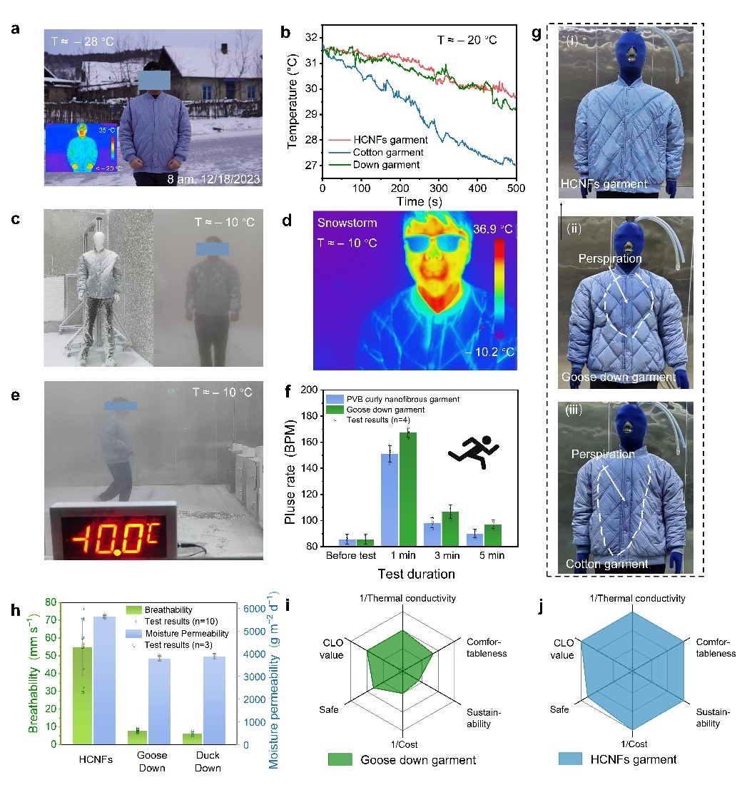 图3.HCNFs作为服装内衬可达到超过羽绒的保暖效果