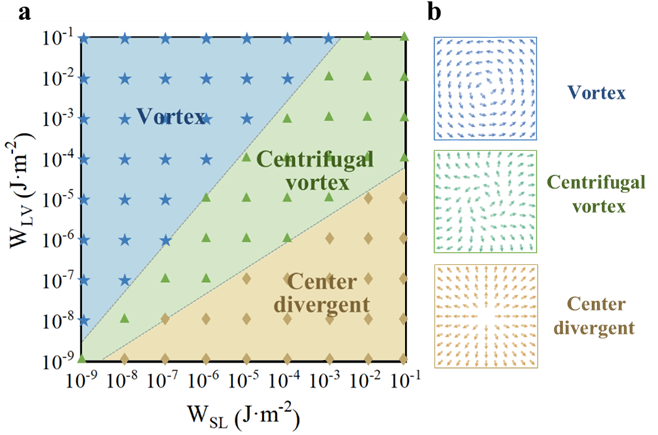 液晶液滴中拓扑畴转变的相场模拟。(a) 极化结构随液晶-基片界面锚定系数(WSL)和液晶-气体界面锚定系数(WLV)的演化规律,不同颜色区块对应双界面锚定协同作用下形成的特征性拓扑构型。(b) 典型极性拓扑畴构型示意图。