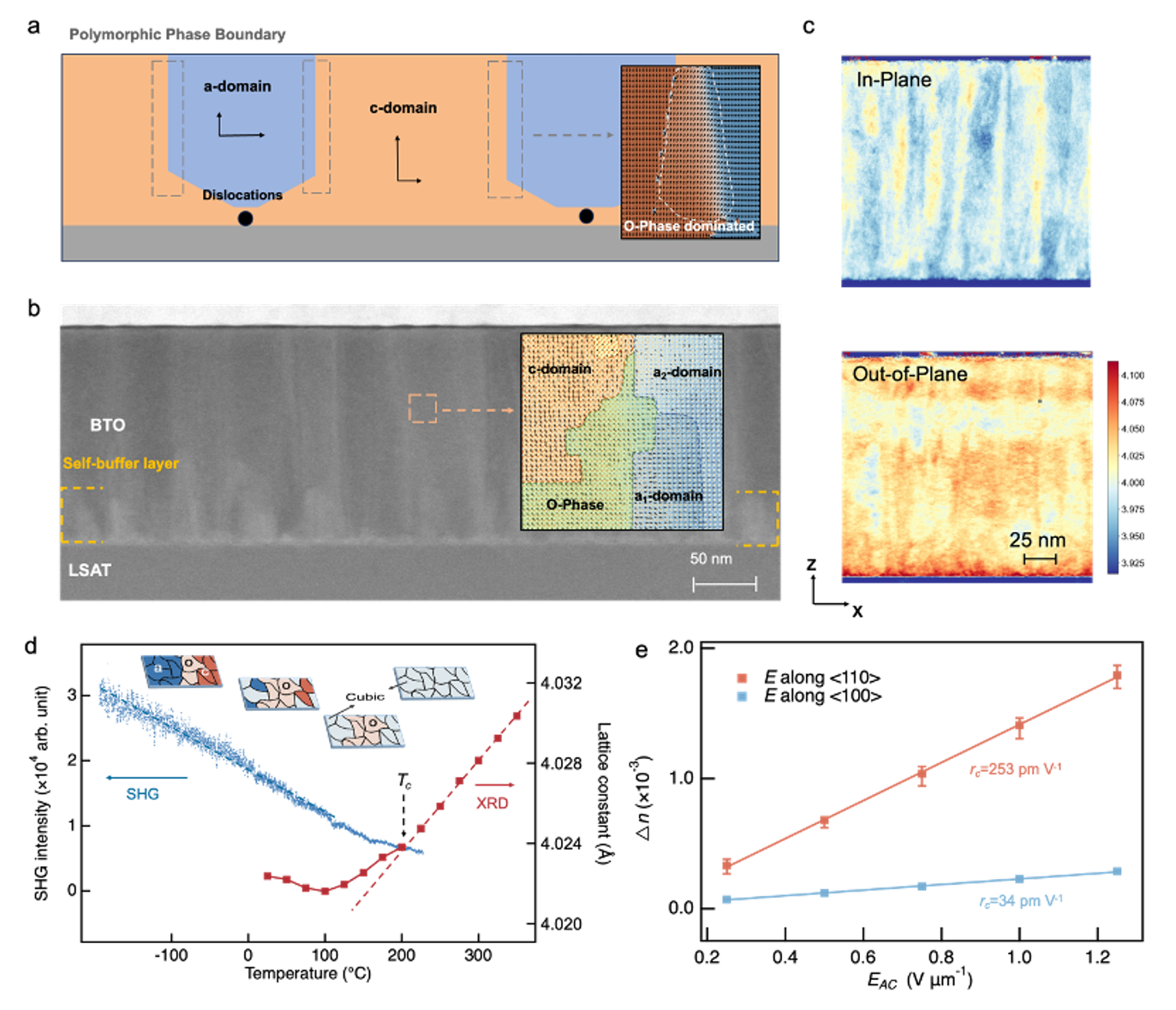 这一材料设计策略利用BaTiO3与LSAT之间的晶格失配,通过控制沉积工艺在薄膜生长初期形成自缓冲层,其中包括周期性位错成核位点,进而诱导上层薄膜产生横向周期性应变调制。电镜表征和相场模拟表明,这一应变状态可以稳定出多相畴结构,在畴壁附近形成过渡区,其中包含正交相和四方相的极化纳米区域。这一结构特征类似铁电材料中的多晶型相界效应,四方相与正交相的耦合作用促进局部极化旋转,从而增强了薄膜电光响应。基于Sénarmont方法的电光测试显示,薄膜在[110]方向面内电场下的有效线性电光系数高达253 pm/V,相较于常规的BaTiO3/LSAT薄膜提升了约45%。此外,上述多相畴结构展现出较高的结构鲁棒性和热稳定性,将薄膜的居里温度提高至200°C。这对改善BaTiO3薄膜的微纳工艺兼容性具有重要意义。