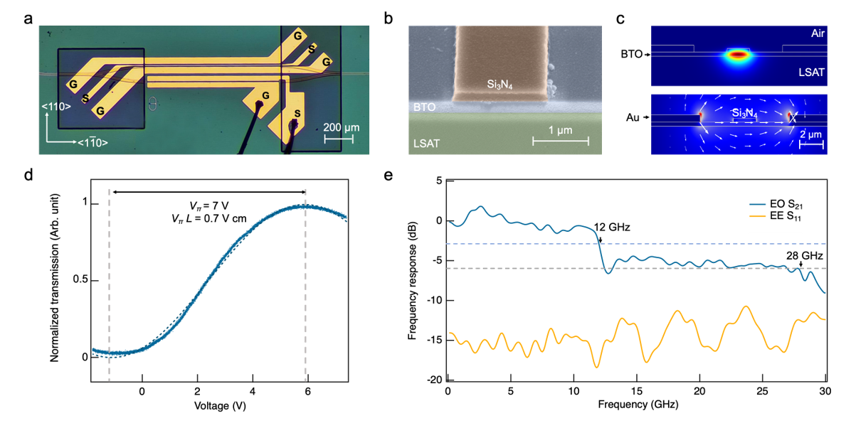图2.BaTiO3薄膜MZI电光调制器芯片的设计和性能测试